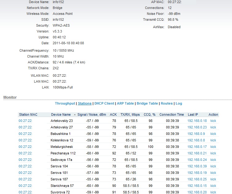 akita Posted December 3, 2011 Posted December 3, 2011 (edited) Вечер добрый ув. пользователи форума! Вопрос у меня такой, будут ли нормально работать два сектора при таком расположении как указано на катинке Максимальную прокачку видел на базе около 10ти мегабит, и то меньше, вот скрин клиентов и базы Всего на базе около 18ти человек, не помню точно, но у всех сигналы не ниже -65, клиенты почти все подключены бриджами 22ми И еще заметил такое: если загрузки от точки нет, то пинг и с нее и с ней 1-3 мс в среднем, это когда в это время нагрузка на базу около 5ти мегабит, но когда пинговать того человека который качает, т.е. его точку, то с ним пинг до 100 и бывает выше, но он стабильно качает в это время, а с сервера такой вот пинг к нему, может так конечно и должно быть не знаю. Но еще один факт, заметил, бывает когда загрузка точки около 8ми мегабит, когда заходишь на вэб интерфейс, база сама перезагружается по-ходу - скидывает клиентов (это было замечено при выключенном airmax, выключил потому что без него пинги стабильнее 1-3 мс, а с ним 3-10мс а то и до 15ти бывает), если аир макс включить тоне замечал такого, чтобы заходя в вэб интерфейс база перезагружалась. Так вот еще вопрос, как то мне кажется маловата скорость для базы с клиентами с такими модуляциями и небольшим их числом максимум до 10ти мегабит, может все дело в таком вот расположении антенн, хотя шум на базе на одной -99 на другой -96. Что можете сказать дорогие Гуру? Думаю может хоть листами железа друг от друга антенны закрыть, и сзади тоже,чтобы заднего лепестка не было, кто что думает? забыл добавить, при такой вот структуре базы из двух секторов. На обоих висит 30 человек где-то, обе работают в бридже, перед ними RB450G, максимум что видел по нагрузке с двух баз где-то 13 мегабит, при тарифах 1-2 мегабита, что думаете, люди не жалуются, вроде-бы все хорошо, но меня всеже чтото смущает. Да, кстати, кто знает сколько PPS через себя в бридже может пропустить rocket M5? и еще, та база которая на скрине работает с клиентами после 4х км дальности (стоят у всех бриджи 22е), а вторая работает на ближних клиентов от 2 до 3 км (нанки и локо 5е) Edited December 3, 2011 by akita Вставить ник Quote