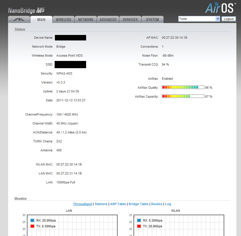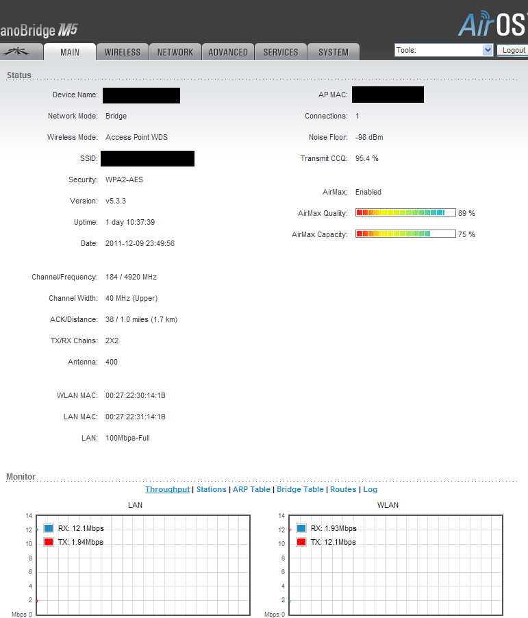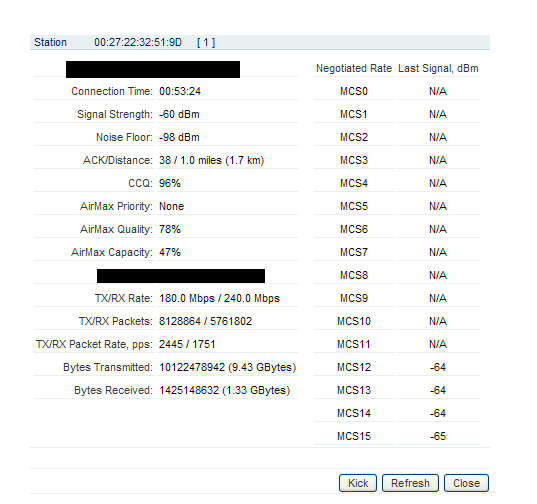 kosmich7 Posted December 9, 2011 Posted December 9, 2011 (edited) Сколько Kpps ? на таком расстоянии AirMax уровень/качество должен быть почти 100% AirMax Priority = Hich !!!!!!! Если уже выложили скрин то странчки Main базы и клиента, линк у вас неважный для 1,5км ! на ST передача низкая это значит на 1метр примерно поднимите и удивитесь что он может. Или юстировка немного неправильная. Попробуй 20Мгц. TR 180 Rx 240 Значит Tr что то мешает например ветка дерева или что-то подобное вблизи ST. Edited December 9, 2011 by kosmich7 Вставить ник Quote