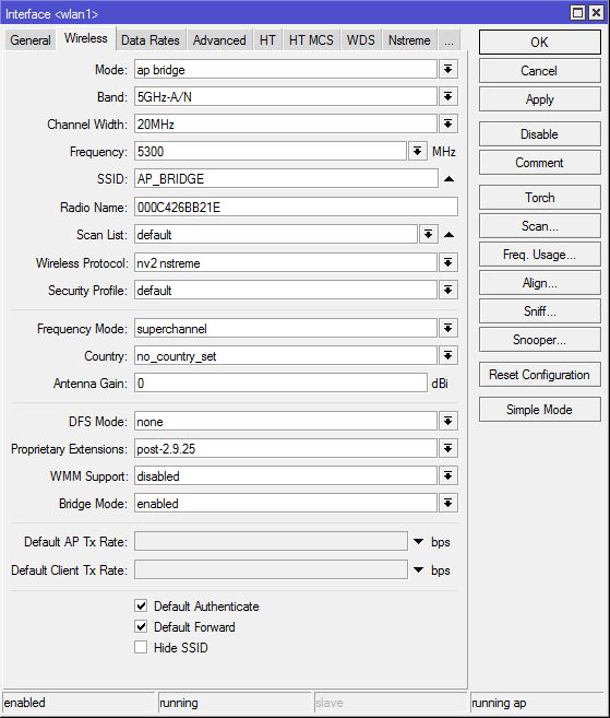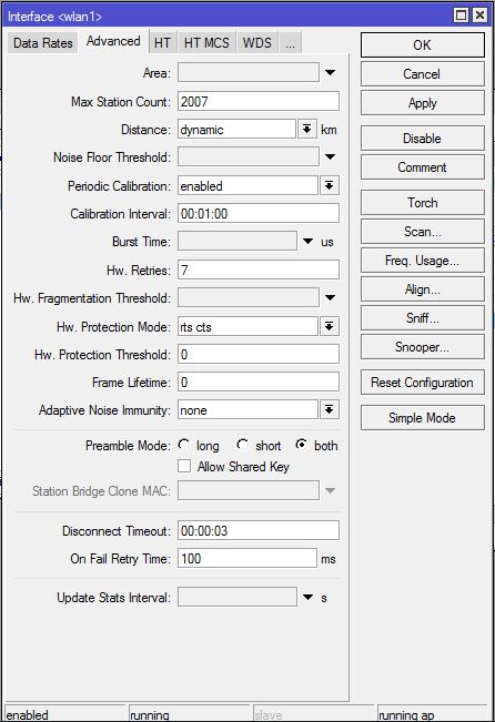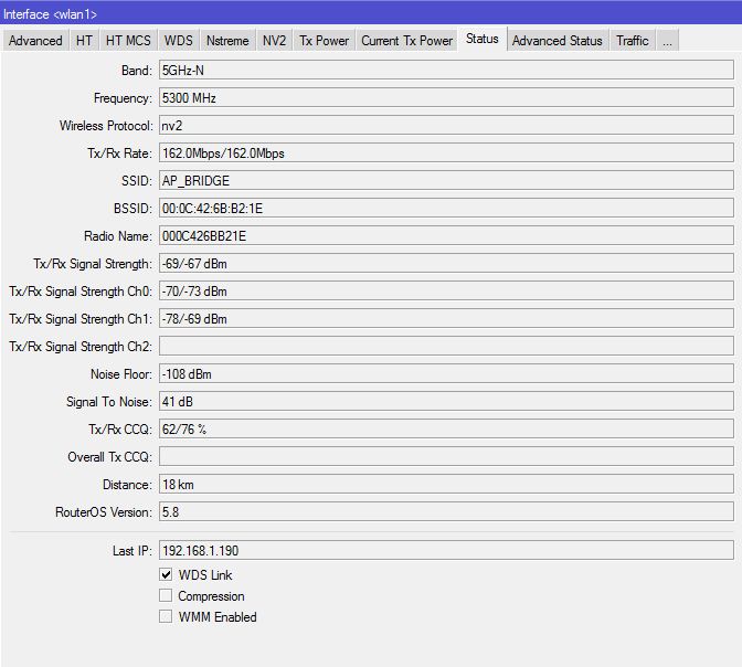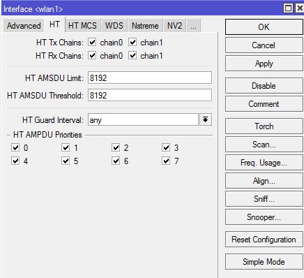 Saab95 Posted December 11, 2011 Posted December 11, 2011 На вкладке WIRELESS Band - определите для себя в каком режиме хотите работать, в A или в N. На клиенте поставьте 5GHZ-A/N, на базе 5GHZ-A или 5GHZ-N. В этом случае клиент в любом будет работать, а база только в том, какой укажите. Это повысит скорость. Wireless Protocol на базе поставьте NV2, на клиенте - ANY. На вкладке ADVANCED Hw.Retries поставьте 15 везде. На вкладке HT Определитесь MIMO антенны у вас или нет и отключите не используемый вами канал. В пункте HT Guard Interval поставьте Long. Так же вы забыли привести вкладку Data Rates. На ней на базе нужно поснимать галочки с не используемых скоростей. Если используете только A, тогда скорости MCS должны быть отключены (галочки сняты), если используете только N, тогда все галочки со скоростей A должны быть сняты. Так же нужно попробовать уменьшить мощность, это так же может повлиять на скорость. Вставить ник Quote