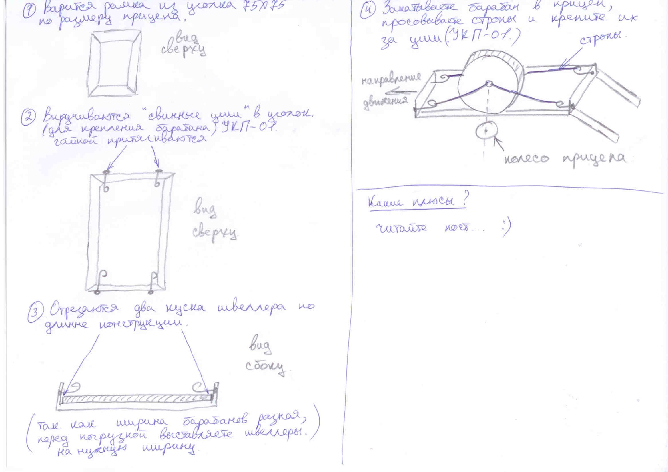 Firsa Posted December 13, 2011 Posted December 13, 2011 (edited) Нарисовал от руки - так быстрее. Какие плюсы: 1) Ну, конечно же - ЦЕНА. Кабелевозы стоят порядка 175 тыс.рур. - не бюджетно! 2) Простота конструкции - четыре куска уголка, 4 куска швеллера, 4 УК-П-01 (в разобранном виде с гайкой) + две стропы по 5 метров (ИТОГО около 3х тыс.рур, если все покупать и самим делать); 3) три часа работы; 4) Универсальность конструкции (под разные ширины барабанов); 5) Не нужно портить стандартный прицеп - вытащил и все (вес конструкции максимум 30-40кг). 6) Возить все можно на любой легковой машине. Закатывается 2мя монтажниками. 7) Вес барабана располагается по всему периметру, так как стоит на швеллерах, а те в свою очередь лежат концами внутри рамки. Минусы конструкции: 1) КОЛХОЗ! (без вопросов и комментов); 2) Бронированного кабеля много не повозишь (вес прицепа с грузом должен быть не более 750 кг. Так что если ДПС остановит.... следите за весом); 3) Ну, может ещё что то... Еще несколько моментов: - Следить нужно за центром тяжести, чтобы барабан располагался СТРОГО под осью прицепа. - При погруске, следите за соединением с авто (лучше, чтоб кто-нибудь наступил, если барабан тяжелый). ВОТ ТАК ВОТ! Патентовать можно? :) Edited December 13, 2011 by Firsa Вставить ник Quote