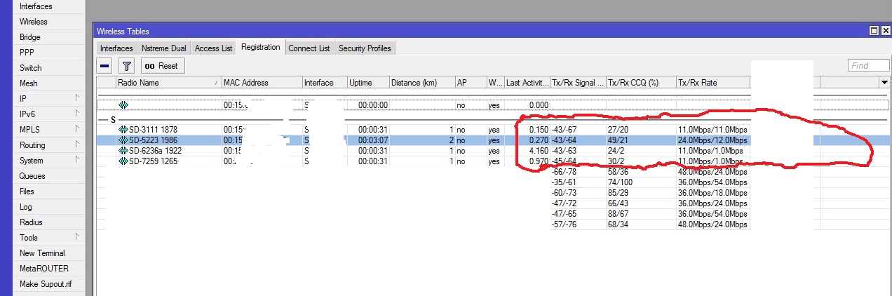 porozut Posted December 15, 2011 Posted December 15, 2011 Доброго всем времени суток. Проблема с МТ433АН - в нём 2 карты год работало всё как часики и вот настал момент хэ =) На одном из радио клиенты примерно в одно и тоже время начинают скакать (дистанция у всех пляшет от 2 до 100км , сигнал так же пляшет ) и самое странное что у всех в этот момент с ССQ вот примерно так 90/30 ,90/12 ,100/5 ну и так далее . Смена частот не помогла ,кабель проверен и заменен куда копать не приложу ума =(( Как видно из скрина клиенты то на БС то отваливаются и так неопределённое время потом всё оживает . Вставить ник Quote