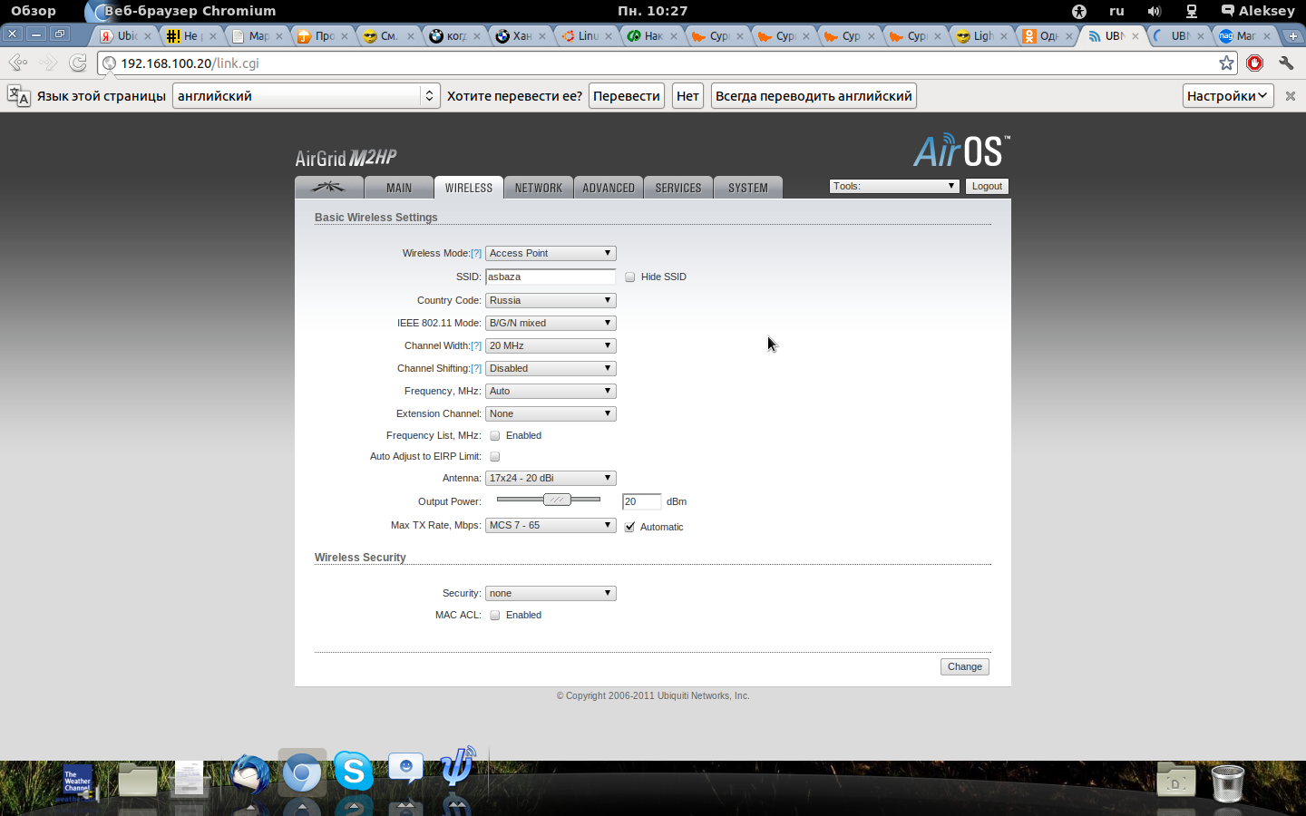 diesels Posted December 26, 2011 Posted December 26, 2011 В общем стоит это железка. Device Name:UBNT Network Mode:Router Wireless Mode:Access Point SSID:AS-baza Security:none Version:v5.3.5. Uptime:2 days 21:19:27 Date:2011-12-22 18:05:23 Channel/Frequency:6 / 2437 MHz Channel Width:40 MHz (Upper) ACK/Distance:54 / 2.5 miles (4.1 km) TX/RX Chains:1X1 Antenna:Not specified WLAN MAC:00:27:22:32:6F:02 LAN MAC:00:27:22:33:6F:02 LAN:100Mbps-Full AP MAC:00:27:22:32:6F:02 Connections: 0 Noise Floor:-96 dBm Transmit CCQ:- AirMax: никто к ней не может подключится. пробовал с шифрованиеи и без. все безтолку. Вставить ник Quote