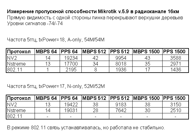 Saab95 Posted January 8, 2012 Posted January 8, 2012 Вот сделал замеры в A-only и N-only на линке 16 км. В N-only в режиме 802.11 работа была очень не стабильна и измерить параметры линка не получилось. Видно что в одних и тех же условиях показания на линке в N-only хуже, чем в A-only. На предыдущих версиях ОС (4-я ветка) в NSTREME удавалось передавать 40000 пакетов, в NV2 было в 2 раза меньше - 20000. Теперь в версии 5.9 в NSTREME пакетная производительность так же упала. Вставить ник Quote