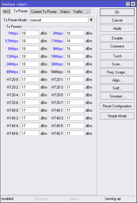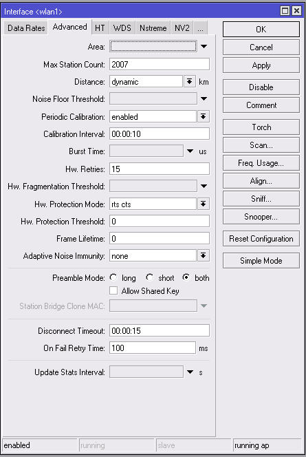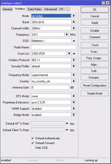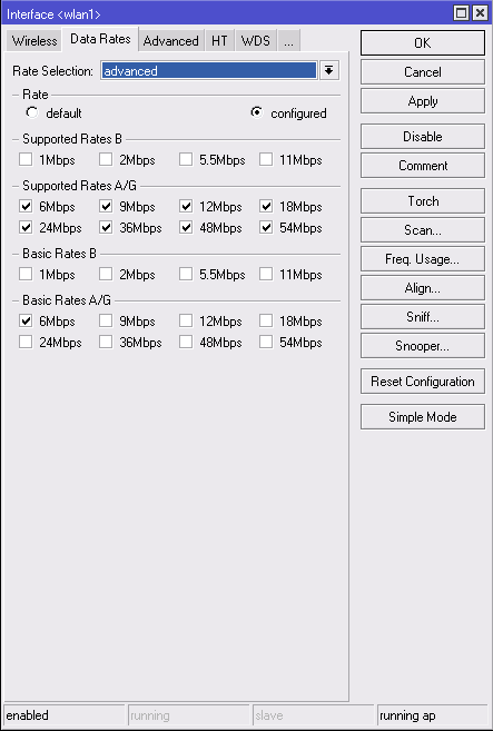 SlipEFR Posted January 11, 2012 Author Posted January 11, 2012 В наших условиях wifi работает по G режиму так как у клиентов обычные Nanostation 2 loco. Зашёл в настройки микротика там где ты сказал yадо просто отключить скорости B/G режимов. У меня стояла галочка в Default. какие галочки нужно снимать именно Вставить ник Quote