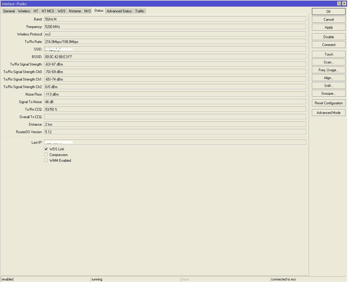 Saab95 Posted January 13, 2012 Posted January 13, 2012 Всё попробовали как было предложено. Когда конектишь точку к микротику сперва все уровни показывает отлично Tx и Rx пишет 54 мб. а когда начинаем качать то Rx всеровно падает до 6 мб. и скорость скачки доходит максимум 70 кб/с. Вообще что то непонятное, На микротике в списке клиентов (WIRELESS--+Registration) справа вверху есть такая стрелка вниз далее Show Columns, включите там столбики Distance, Tx/Rx CCQ, Signal To Noise. И сообщите эти данные сюда. Вставить ник Quote