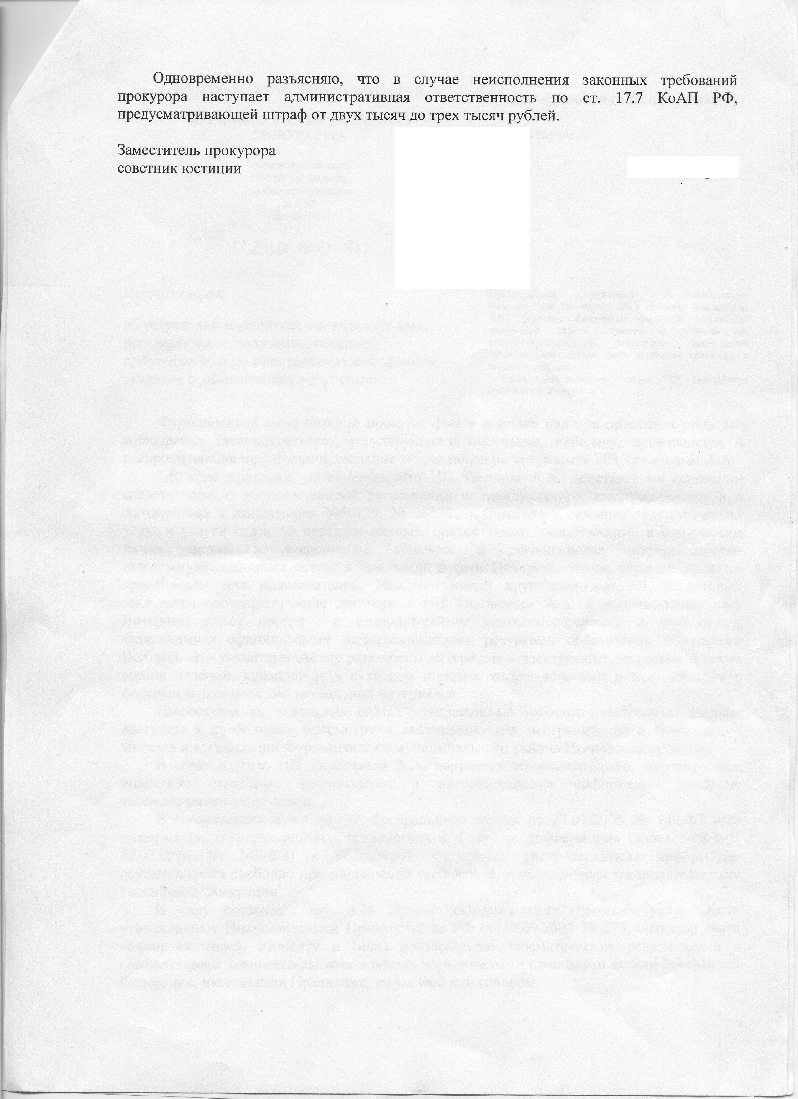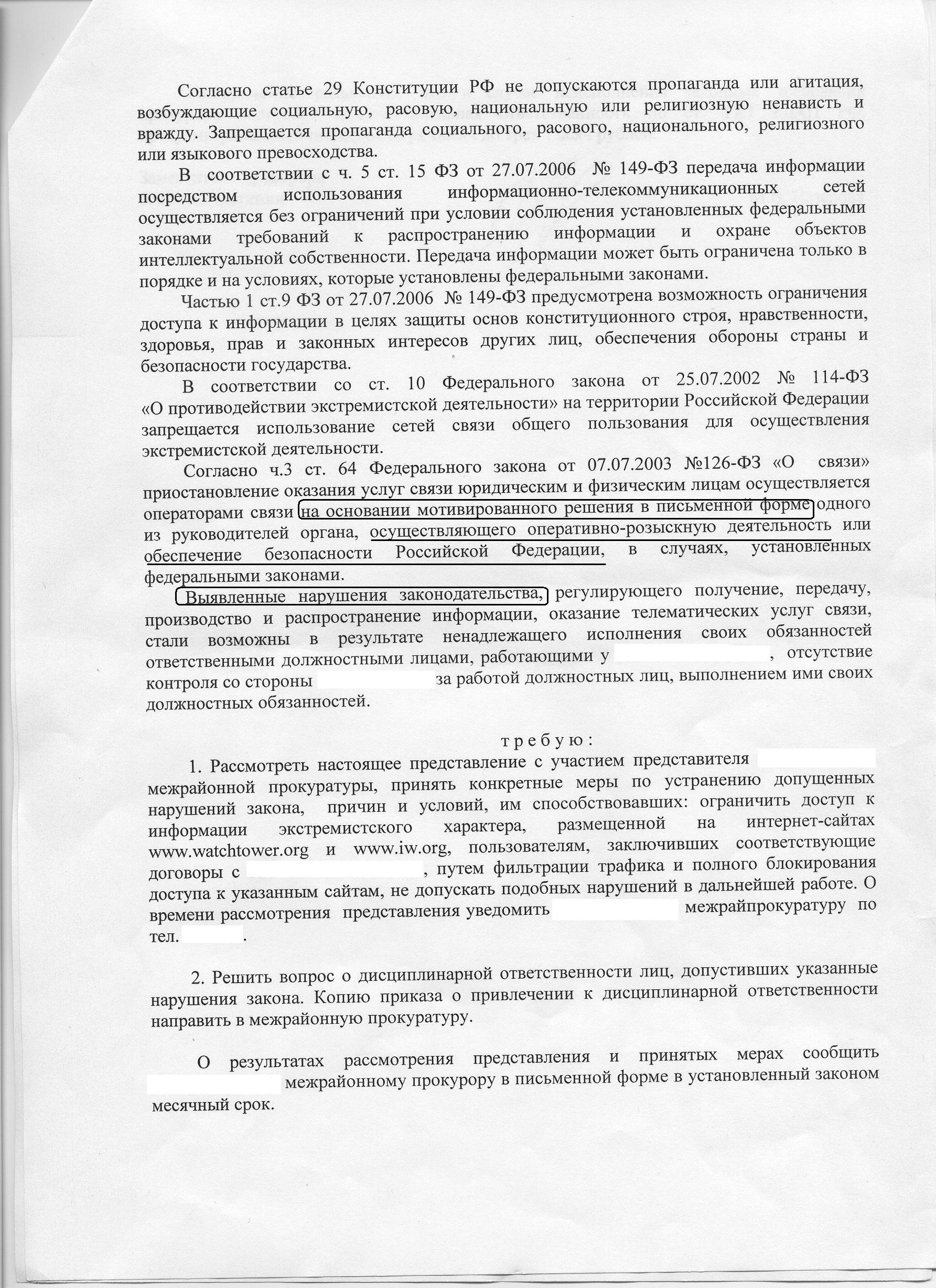 AlKov Posted January 12, 2012 Posted January 12, 2012 (edited) Предоставляем доступ в Интернет физ. лицам в небольшом районном городе. Предыстория: за неделю "до того как" руководитель предприятия был приглашен в прокуратуру, где имел беседу на тему, сможем ли мы заблокировать доступ к определенным сайтам, признанными экстремистскими. На что был дан положительный ответ. Далее приходит нижеследующее представление (до этого ни одной бумаги не приходило!). Выделенные фрагменты вызывают недоумение - что же всё-таки было нами нарушено? Ломаем голову над тем, каким образом реагировать на данный документ, чтобы не навредить себе.. Озвученные сайты заблокировали сразу же после получения представления. Считаю, что если выполнить ВСЕ пункты представления, а конкретно - "устранить допущенные нарушения закона", то это будет автоматическое признание в пособничестве распространения экстремистской информации. Ну и отсюда совсем непредсказуемые последствия, лучшим из которых вижу приостановку, или лишении лицензий.. Как считает сообщество, я не слишком сгустил краски? Edited January 12, 2012 by AlKov Вставить ник Quote