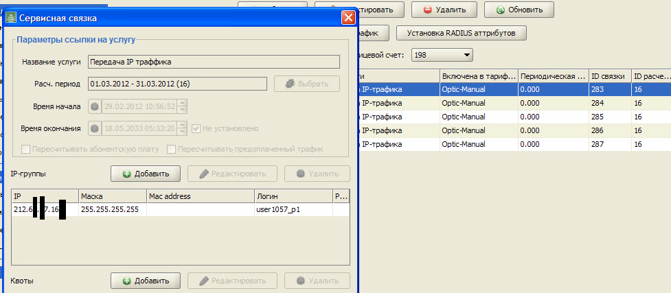 taf_321 Posted March 14, 2012 Posted March 14, 2012 А у вас точно логины с адресами 212.6.7.14-16 относятся к разным сервисным связкам? Просто мне видится, что к связке 283 привязано 3 логина user1057_p3-p5. Не сочтите за наглость, покажите еще скрин окна Сервисные связки->Передача трафика с id:283->Редактирование Вставить ник Quote
