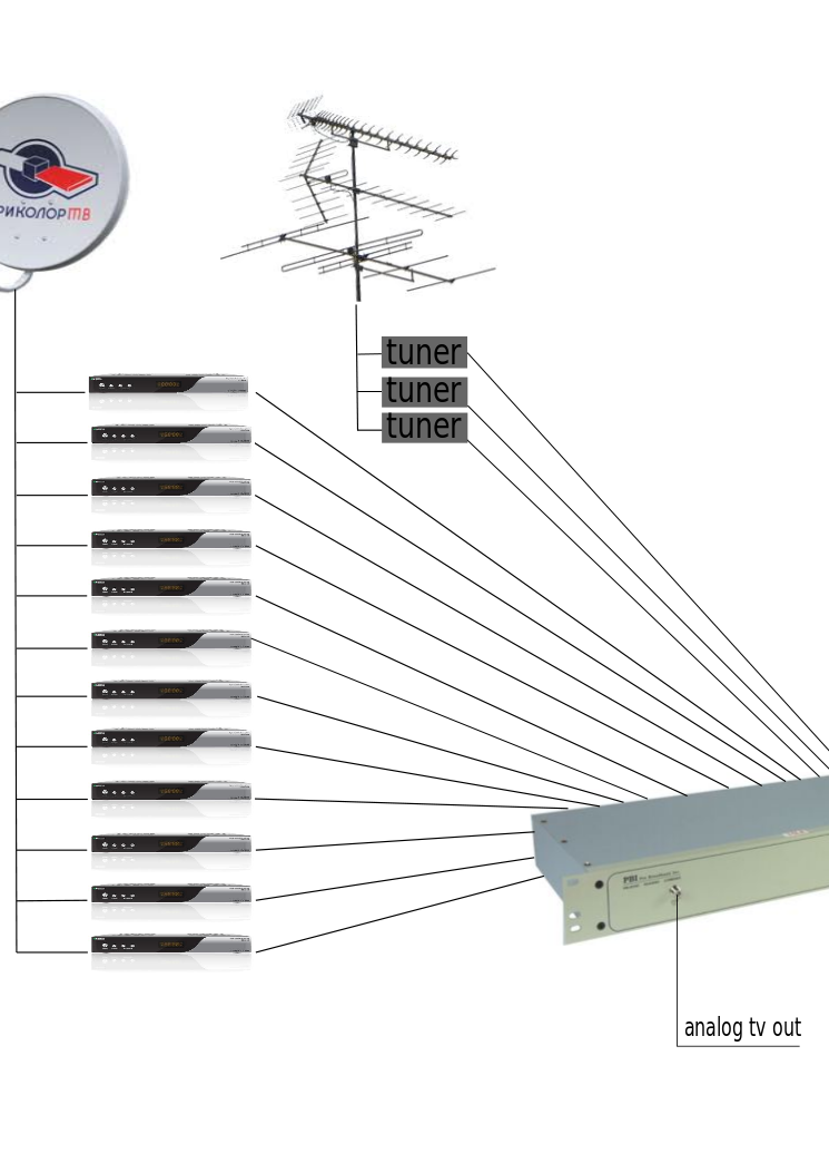 citruss87 Posted March 11, 2012 Posted March 11, 2012 Как всегда начальство поставило цель. Нужно как можно дешевле развернуть ГС для 400 - 600 абонентов в мааленьком микрорайоне. Про легальность контента можно забыть. Вот и пришла мне на ум вот такая идея, правда незнаю будет работать или нет (а может чего-то упустил или еще чего). В общем берем одну тарелку триколор (т.к. у нее все каналы транслируются в левой круговой поляризации, да и места на крыше маловато под несколько тарелок) и от нее заводим кабеля в несколько ресиверов 30-40, а может и больше, каждый ресивер настраиваем на определенный канал. Выход с ресиверов запихиваем в сумматор тв сигнала, параллельно запихиваем в сумматор эфирные каналы с тв антенны (не хотелось бы ставить комп с кучей тв-тюнеров, может что-то другое посоветуете). Вставить ник Quote