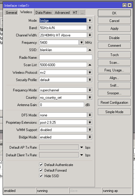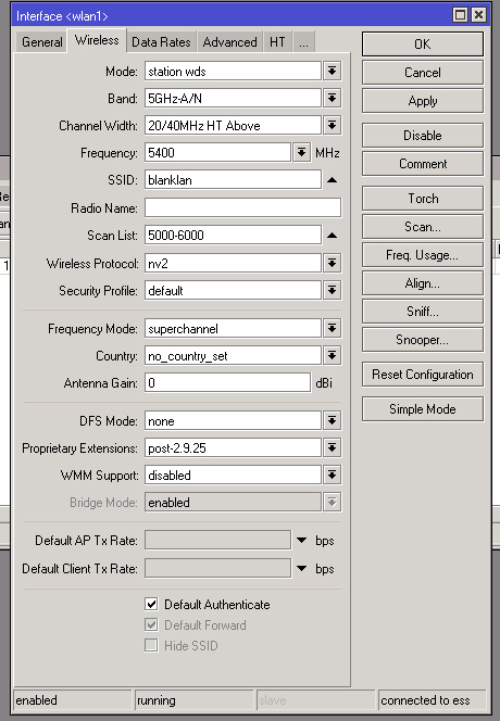 fhntv_smart Posted March 31, 2012 Posted March 31, 2012 Вот и я первый раз столкнулся с задачей поднять мост между двумя L3 тиками. Первый бридж. Тут без вариантов. второй ставлю station - коннектится в течении 10 секунд. Ставлю Station-wds, молчит. Ставлю Station-bridge, подключается. Почитал вики, стейшон-бридж, это типа стайшон-вдс, только чуть другое. Т. е. тоже передача пакетов идет на L2 без подмены мак адресов. Я кажется понял. в режиме стейшон вдс он подключается не при первом сканировании эфира, а секунд через тридцать... так как в вдс режиме у него может быть не одна база, и он пытается найти все доступные. позже попробую еще раз. Получается, для предварительной наводки лучше поставить стейшон, чтобы оно как можно быстрее зацепилось когда на крыше мы сводим антенны. Вставить ник Quote