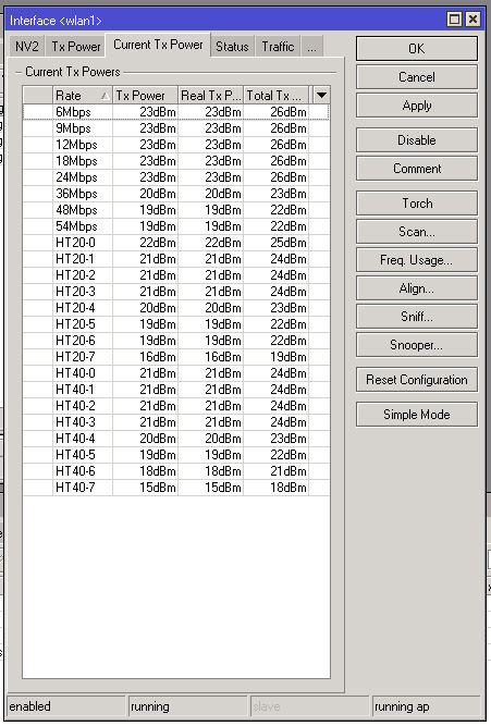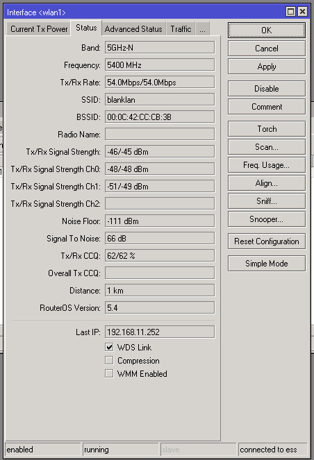 Saab95 Posted March 28, 2012 Posted March 28, 2012 Вы забыли самое главное - обновить версию ПО до последней, скачайте http://download2.mikrotik.com/routeros-mipsbe-5.14.npk и перетащите мышкой в винбокс, далее как закачается зайдите в меню SYSTEM--+REBOOT и подождите минут 5 пока оборудование обновится. Сначала сделайте это на клиенте удаленном, потом на базе. Они после всего обратно соединятся. Далее уменьшайте мощность сначала со стороны базы по децибельчику вниз и добивайтесь сигналов под -60..-65 и максимального CCQ и модуляций, далее на клиенте то же самое, потом проводите тесты встроенной утиликтой TOOLS--+Bandwidth test. Вставить ник Quote