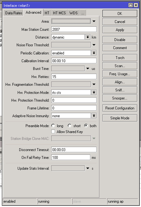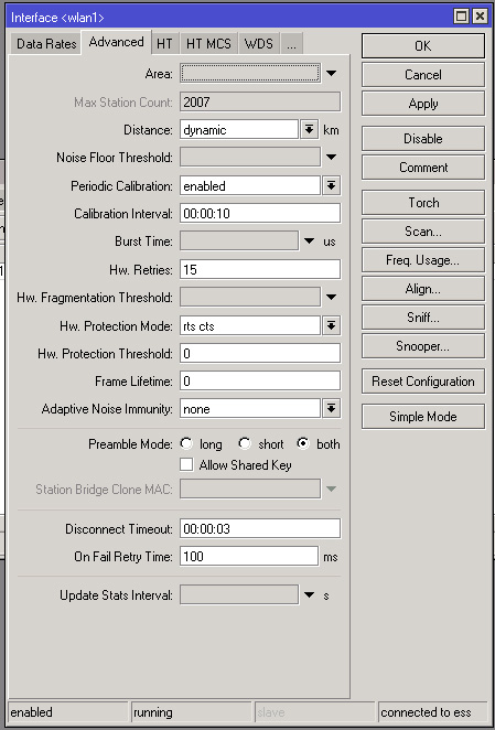 Барагоз Posted March 31, 2012 Author Posted March 31, 2012 Ну вот, начался первый гемор. После 2,5 суток прекрасной безглючной работы начал отваливаться клиент. В логе следующее: 09:14:12 wireless,info 00:0C:42:CC:CB:3B@wlan1: lost connection, control frame timeout 09:15:02 wireless,info 00:0C:42:CC:CB:3B@wlan1 established connection on 5400, SSID blanklan 09:17:11 wireless,info 00:0C:42:CC:CB:3B@wlan1: lost connection, control frame timeout 09:18:01 wireless,info 00:0C:42:CC:CB:3B@wlan1 established connection on 5400, SSID blanklan 09:18:16 wireless,info 00:0C:42:CC:CB:3B@wlan1: lost connection, medium-access timeout 09:19:07 wireless,info 00:0C:42:CC:CB:3B@wlan1 established connection on 5400, SSID blanklan 09:19:55 wireless,info 00:0C:42:CC:CB:3B@wlan1: lost connection, control frame timeout 09:20:46 wireless,info 00:0C:42:CC:CB:3B@wlan1 established connection on 5400, SSID blanklan 11:35:29 wireless,info 00:0C:42:CC:CB:3B@wlan1: lost connection, control frame timeout 11:36:19 wireless,info 00:0C:42:CC:CB:3B@wlan1 established connection on 5400, SSID blanklan 20:49:41 wireless,info 00:0C:42:CC:CB:3B@wlan1: lost connection, control frame timeout 20:50:32 wireless,info 00:0C:42:CC:CB:3B@wlan1 established connection on 5400, SSID blanklan То есть может 15 минут стабильно проработать, может 10 часов. Когда работает, всё прекрасно, прокачка, пинги итп. Во время отвалов никакой особой нагрузки на линк нет. Куда копать? Вставить ник Quote
