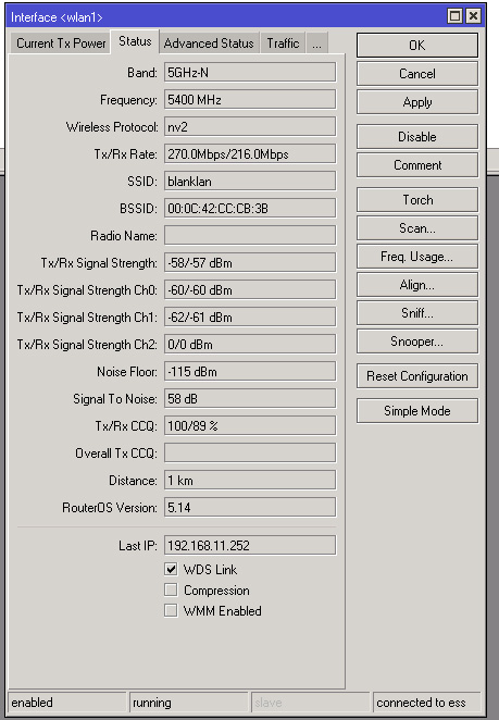 Saab95 Posted March 31, 2012 Posted March 31, 2012 Вот видите CCQ в одну сторону не максимальное, значит в этом месте и проблема, rx это в приеме данных с базы. На таком маленьком расстоянии вообще 100/100 железно стоять должно. Попробуйте со стороны базы уменьшить/увеличить мощность на несколько дбм наблюдая показания на клиенте. Попробуйте на клиенте на вкладке ADVANCED в пункте Noise Floor Threshold указать уровень шума вручную -100 и поиграйтесь с этим значением в большую или меньшую сторону, наблюдая параметры в статусе и тестируя скорость через канал. Попробуйте на базе на вкладке NV2 параметр TDMA Period Size поменять в пределах 1-5. Чем меньше значение - тем меньше задержка. Вставить ник Quote