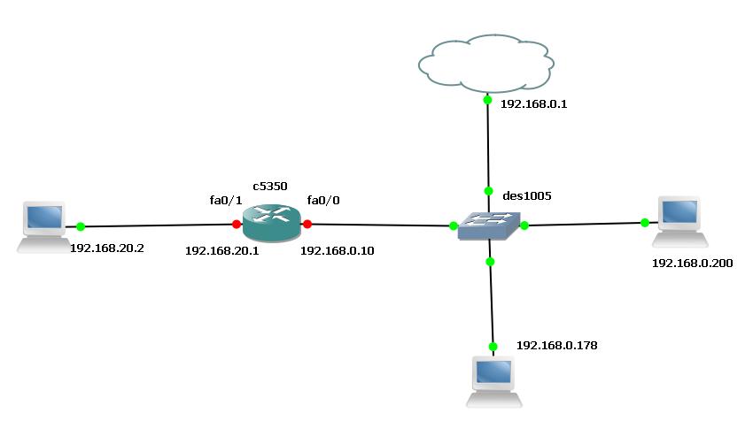 smart85 Posted April 4, 2012 Posted April 4, 2012 Добрый день Господа! Появилась возможность протестировать AS5350. fa0/0 включил в локальную сеть, fa0/1 в тестовую в виде прямого подключения к ноуту. 192.168.0.0/24 - lan 192.168.20.0/24 - test net Задача кажется жутко тривиальной. Ноут (192.168.20.2) может пинговать оба интерфейса (fa0/0 - 192.168.0.10, fa0/1 - 192.168.20.1), а так же один пк локалки (192.168.0.178). Другие узлы не пингуются. С циски пингуется всё. Привожу схему и конфиги ! version 12.3 service timestamps debug datetime msec service timestamps log datetime msec service password-encryption ! hostname something ! boot-start-marker boot system flash c5350-ik8s-mz.123-21.bin no boot startup-test boot-end-marker ! no logging console enable secret 5 $1$v8K/$dY0ZHdYBLrUkRaW5Yhl5U1 ! ! ! resource-pool disable spe default-firmware spe-firmware-1 aaa new-model ! ! aaa session-id common ip subnet-zero ! ! ip cef ip domain name xxxxx ip name-server xxxxx ! username xxxxxx password 7 110D1C03141D05 ! ! controller E1 3/0 ! controller E1 3/1 ! ! ! ! interface FastEthernet0/0 ip address 192.168.0.10 255.255.255.0 duplex full speed 100 ! interface FastEthernet0/1 ip address 192.168.20.1 255.255.255.0 duplex full speed 100 ! interface Serial0/0 no ip address shutdown clock rate 2000000 ! interface Serial0/1 no ip address shutdown clock rate 2000000 ! interface Async1/00 no ip address encapsulation slip ! . . ! interface Async1/59 no ip address encapsulation slip ! interface Group-Async0 no ip address encapsulation slip no group-range ! ip classless ip route 0.0.0.0 0.0.0.0 192.168.0.1 ip http server ip http authentication local no ip http secure-server ! ! ! ip access-list standard ssh_access permit 10.10.0.0 0.0.255.255 permit 192.168.0.0 0.0.255.255 ! snmp-server community xxxxx RO snmp-server enable traps tty ! ! ! ! ! ! ! banner motd Hello! I'm $(hostname). You are connected on line $(line) on domain $(domain) ! line con 0 line aux 0 line vty 0 4 access-class ssh_access in exec-timeout 0 0 password 7 1413170D0F0B24 transport input telnet ssh line 1/00 1/59 modem InOut ! scheduler allocate 10000 400 end something#sh ip route Codes: C - connected, S - static, R - RIP, M - mobile, B - BGP D - EIGRP, EX - EIGRP external, O - OSPF, IA - OSPF inter area N1 - OSPF NSSA external type 1, N2 - OSPF NSSA external type 2 E1 - OSPF external type 1, E2 - OSPF external type 2 i - IS-IS, su - IS-IS summary, L1 - IS-IS level-1, L2 - IS-IS level-2 ia - IS-IS inter area, * - candidate default, U - per-user static route o - ODR, P - periodic downloaded static route Gateway of last resort is 192.168.0.1 to network 0.0.0.0 C 192.168.20.0/24 is directly connected, FastEthernet0/1 C 192.168.0.0/24 is directly connected, FastEthernet0/0 S* 0.0.0.0/0 [1/0] via 192.168.0.1 something# something#ping 192.168.0.1 Type escape sequence to abort. Sending 5, 100-byte ICMP Echos to 192.168.0.1, timeout is 2 seconds: !!!!! Success rate is 100 percent (5/5), round-trip min/avg/max = 1/4/16 ms something# something#sh arp Protocol Address Age (min) Hardware Addr Type Interface Internet 192.168.0.10 - 000b.fda2.0242 ARPA FastEthernet0/0 Internet 192.168.0.1 0 0015.171d.61d6 ARPA FastEthernet0/0 Internet 192.168.20.1 - 000b.fda2.0243 ARPA FastEthernet0/1 Internet 192.168.20.2 2 001d.7227.0820 ARPA FastEthernet0/1 Internet 192.168.0.178 0 0011.6b31.a0ac ARPA FastEthernet0/0 something# Как понять такое поведение в виде доступности только одного узла локалки из тестовой сети? Может я что то упускаю? А 192.168.0.1 что знает о маршруте в сеть 192.168.20.0/24 ? Вставить ник Quote
