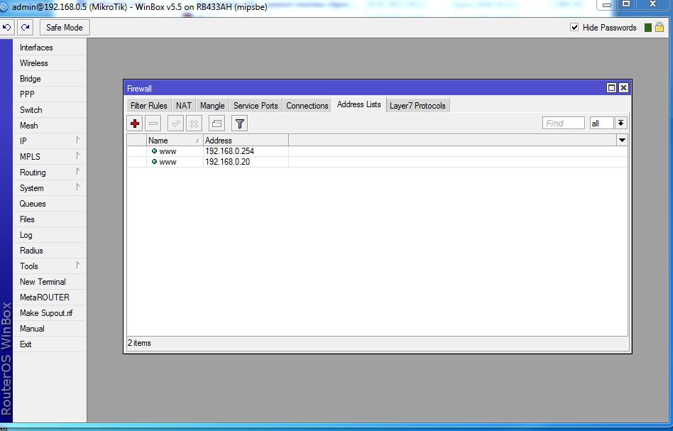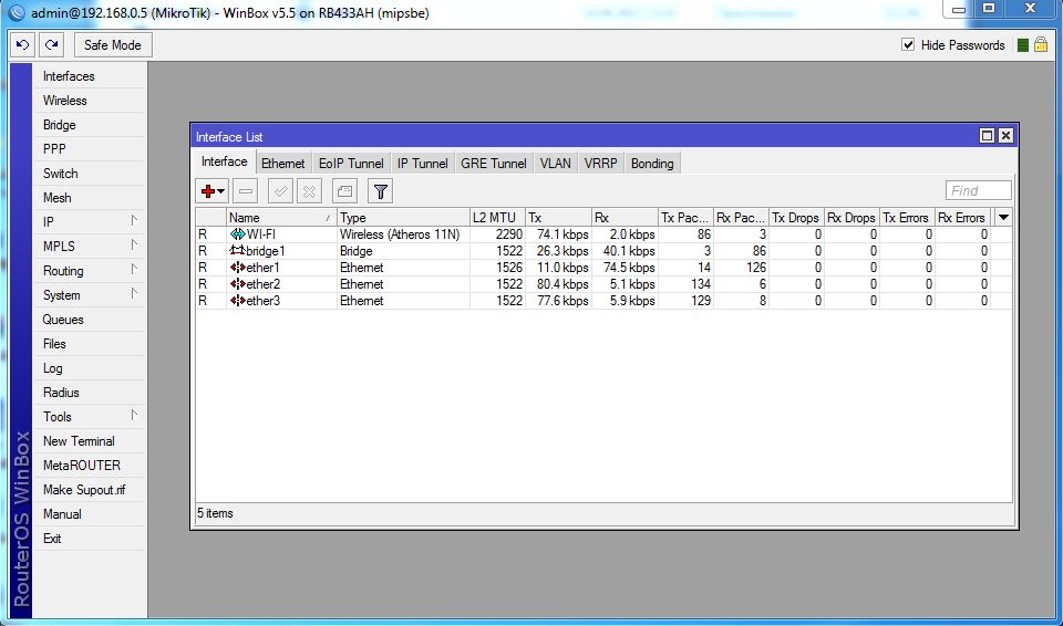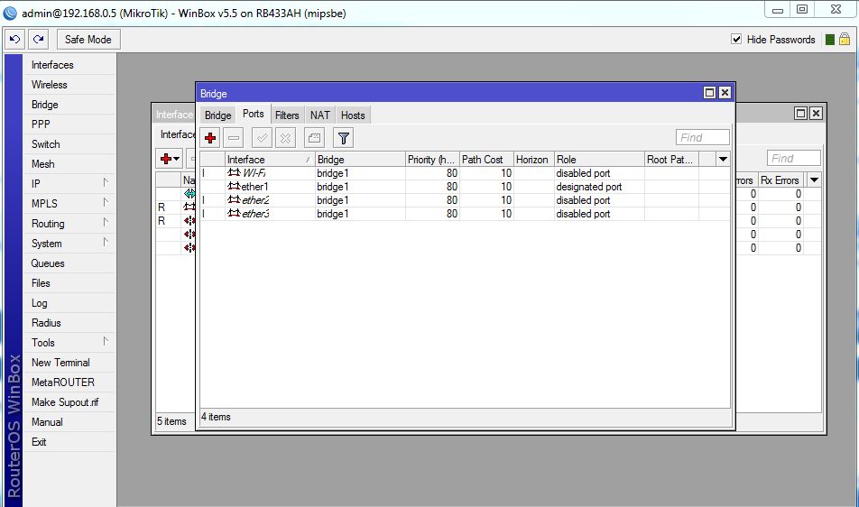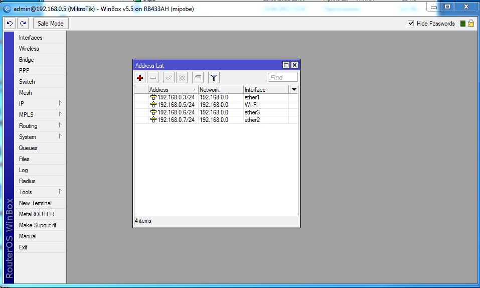 Saab95 Posted May 27, 2012 Posted May 27, 2012 Тогда вам надо на Ether1 прописать IP-адрес провайдера а в маршрутах IP--+Routes установить маршрут на 0.0.0.0/0 на адрес вашего маршрутизатора провайдера. Порт Ether1 добавлять в бридж не надо. Далее создать PPTP_Client где указать логин и пароль, поставить галочку Use Peer DNS и Add Default Gateway. После этого добавляете в бридж порты Ether2, Ether3 и Wlan1, на бридж указываете адрес 192.168.0.1/24 (заходите в IP--+Address жмете + и прописываете адрес и выбираете интерфейс Bridge1) далее настраиваете DHCP сервер в пункте IP--+DHCP Server через кнопку DHCP Setup. Настраиваете беспроводную карту в режим AP Bridge и на вкладке WDS указываете Dynamic WDS и имя вашего бриджа. Вставить ник Quote