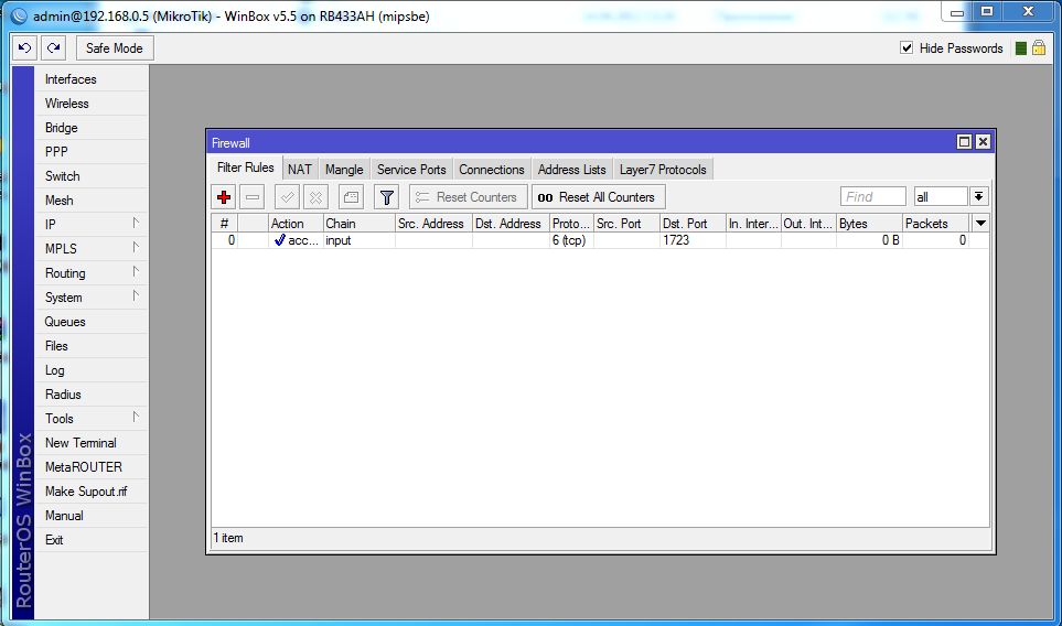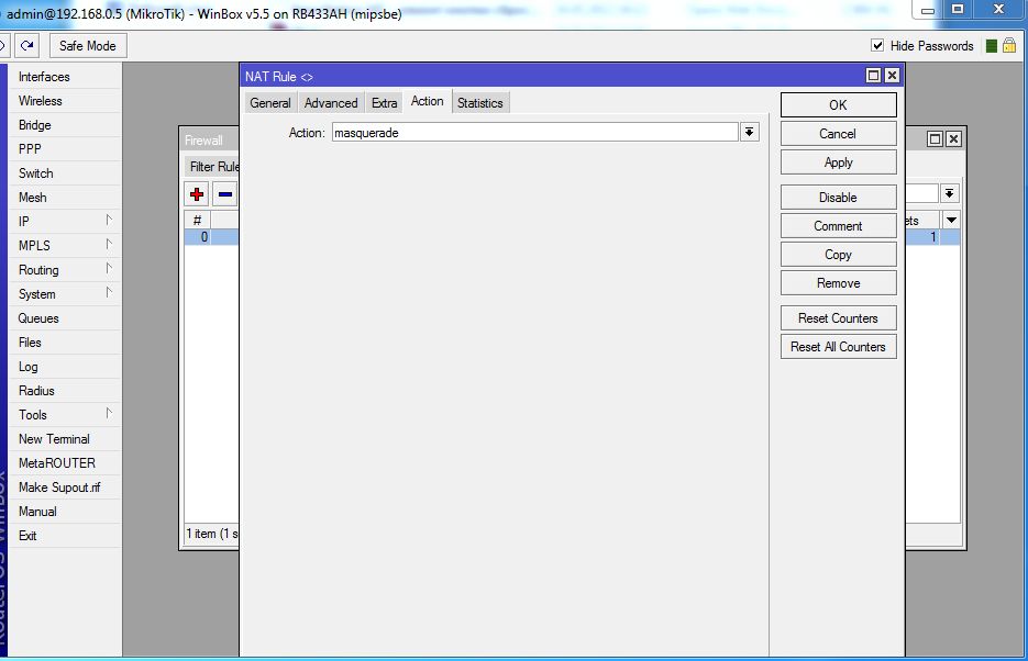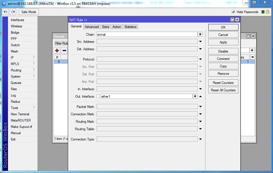 Saab95 Posted April 26, 2012 Posted April 26, 2012 Так вам надо на RB433 зайти в меню PPP и нажать + выбрать там PPTP Client, указать адрес сервера и учетные данные, нажать ок и соединение должно установиться. Далее заходите в раздел IP--+DNS и ставите галочку Allow Remote Request. Заходите в IP--+Firevall на вкладку NAT, жмете + и в новом правиле ничего не трогая заходите на вкладку Action и выбираете в списке Mascuarde. После этого если адресация между вашими устройствами настроена верна интернет заработает. Вставить ник Quote