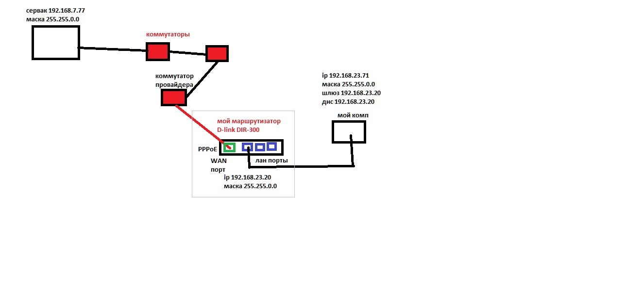 makc-666 Posted April 28, 2012 Posted April 28, 2012 Есть маршрутизатор D-link Dir-300, подключен к провайдеру через витую пару. В Wan порт подключил кабель который идет от провайдера, настроил PPPoE Инет заработал, на маршрутизаторе настроил ip 192.168.23.20 с маской 255.255.0.0, после, у себя на компе указал ip 192.168.23.71 с маской 255.255.0.0 шлюз 192.168.23.20 и днс 192.168.23.20 Инет на компе работает, теперь проблема не могу достучаться до сервака у которого адрес 192.168.7.77 как мне настроить маршруты, что бы можно было увидеть сервак и подключиться к DC++ ? Вставить ник Quote
