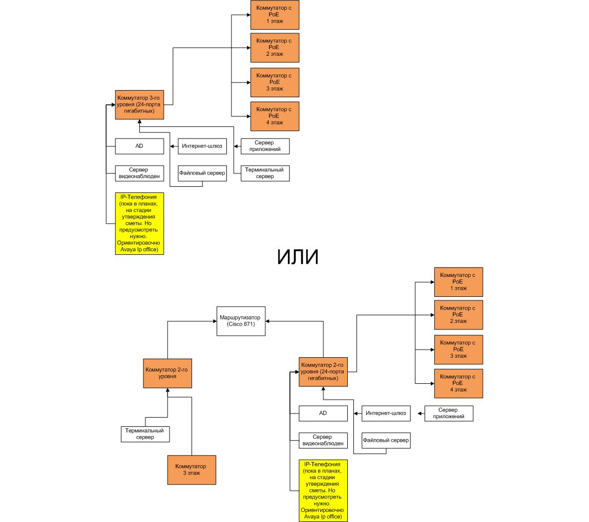 idc Posted May 1, 2012 Posted May 1, 2012 Всех с праздником. Выбил небольшой бюджет на апгрейд сети. Сейчас в наличии куча неуправляемых свичей д-линк (которым дорога в корзину) и маршрутизатор циско 871. Сейчас физически имеем две изолированных друг от друга сети. Здание 4-х этажное. В серверной стоит два д-линка выступающих в роде магистральных свичей. На каждом этаже стоит по свичу для доступа в сеть 1. На 3-м этаже стоит 5 свичей для доступа в сеть 2. Общее количество пользователей 100+. Но такая схема по определенным причинам сейчас не подходит. Сервакам из одной локальной нужно стучаться к серверам и интернет-шлюзу в другую сеть, + иногда нужно бросать информацию между сетями. Да и неуправляемые свичи не дают возможности управлять сетью. Есть два пути: Вариант первый. Наиболее простой и бюджетный. Прикупить два нормальных управляемых гигабитных свича 2-го уровня. Поставить их в серверной, соединить циской 871. На этажах поставить 48-портовые веб-управляемые свичи с PoE (планируется внедрение ip-телефонии) для доступа. На 3-м этаже таких свичей для доступа будет 2 (что конечно же увеличение стоимость решения). Слабым местом здесь на мой взгляд будет 871 циска (читал о проблемах с пропускной способностью). Вариант второй. Покупаем в серверную один 24-х портовый гигабитный свич 3-го уровня (ядро сети). На этажах поставить 48-портовые веб-управляемые свичи с PoE (тут уже их нужно 4 штуки, в не 5 как в первом варианте). Какого пути придержаться? На какие модели свичей стоит обратить внимание с учётом вышеизложенного? Сейчас склоняюсь между циской и хп. По циске большe литературы, + знакомые, отучившиеся на ссна. Но и дороже этот вариант. Бюджет на свич/свичи в серверную и два свича (на первое время, потом еще 2), которые будут стоят на этажах на уровень доступа – 120-150 т.р. Вставить ник Quote
