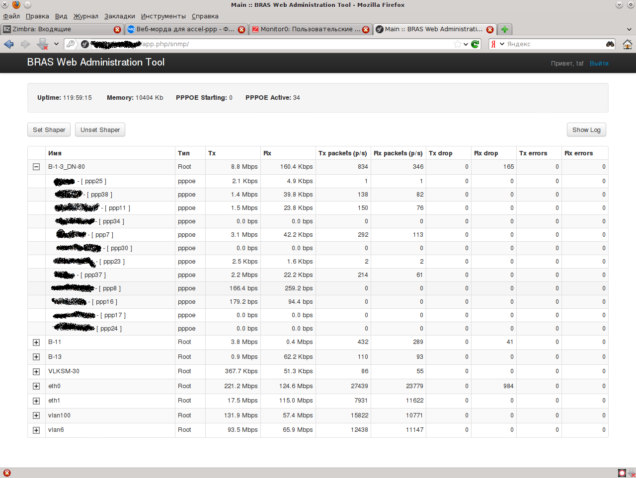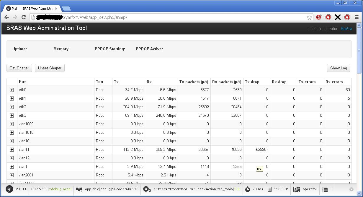 taf_321 Posted May 5, 2012 Posted May 5, 2012 (edited) Небольшая интсрукция по установке в файле Symfony/README.txt Основные изменения от предыдущей версии: - отказ от AJAX в интерфейсе - в целях увеличения производительности опрос данных производится напрямую, в настройках accel-ppp надо включить tcp: [cli] tcp=127.0.0.1:2001 - команды accel-ppp отдаются так же через tcp-соединение, в системе должен быть установлен netcat - добавлена возможность назначать на системные интерфейсы удобные по смыслу превдонимы (vlan100500 -- "Пупкинская 256") - управление пользователями вебморды производтся так же через web - добавлено разделение прав на админов и простых пользователей дополнение от 2013-03-25: - сортировка по отображаемым именам интерфейсов - ручной ввод блокируемого MAC-адреса Скачать Edited March 25, 2013 by taf_321 Вставить ник Quote