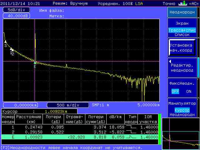 iennefer Posted May 10, 2012 Posted May 10, 2012 (edited) На днях мне в руки попал аппарат Yokogawa AQ7275. Настраивал настраивал его и в итоге пришёл к выводу, что я просто не умею им пользоваться походу. Все рефлектограммы выглядят как синусойды. Хотя видел рефлектограмму снятую с него кем то выглядит как прямая линия, на которой видны и изгибы и сварки и стыки. А у меня синусойда которая мне вообще непонятна. Что я не так сделал? Сейчас лежит передомной нормализующая катушка одномод длинной 1 км. IOR 1.4640 - выбрал как у стекла корнинг одномод (незнаю точно что выбрать) Обратное рассеивание стоит -52.00 dB Метод аппроксимации (маркер) LSA (TPA выбирал тоже, особой разницы не увидел) Длинна волны 1550нм Диап.Расстояния 5км (мерю сразу две катушки по 1 км, поэтому взял расстояние 5км)кстати если выбрать автомат. то он расстояние пишет 500 метров, он как будто не умеет определять дистанцию автоматически Дл. импульса выставил 100нс (делал все возможные которые есть, но всё равно синусойда осталась синусойдой) Ослабление стоит авто, а на авто он выбирает 0.00 dB Метод усреднения Быстрый время усреднения 10 сек (тоже игрался с этим параметром, синусойда просто начинала плавать сильнее или слабее) Что я не так делаю, может кто пользовался именно этим прибором. НА первой картинки это то что сейчас получается при тестировании. а на картинки под названием йцу таже самая катушка, только вот как то уже по другому настроенна. йцу.0004.BMP Edited May 10, 2012 by iennefer Вставить ник Quote