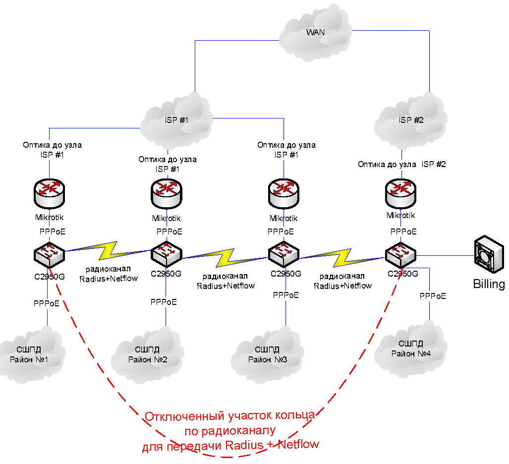 saaremaa Posted May 16, 2012 Posted May 16, 2012 (edited) Доброе %время_суток, Коллеги! Прошу помощи в решении задачи. Исходные данные: 1. Схема сети. 2. Сеть географически разнесена на 4 района. Районы с 1 по 3 подключаются в точке присутствия к провайдеру ISP#1. Район 4 подключается в точке присутствия к провайдеру ISP#2. 3. ISP#1 выдает блок IP адресов для раздачи абонентам с привязкой на узел Района т.е. блок IP адресов района 1 не может быть использован в другом районе. ISP#2 выдает свой блок IP адресов для раздачи абонентам в районе №4 и не может быть использован в районах с 1 по 3. 4. Абоненты выходят в Сеть по технологии PPPoE c авторизацией на Mikrotik своего района. 5. Биллинг находится в районе №4 и обслуживает (авторизует считает статистику) все районы с 1 по 4. 5. Mikrotik каждого района связан с биллингом через радиоканал(кольцо). Netflow+Radius-запросы передаются в отдельном vlan. 6. Проложить оптику или арендовать волокно между районами нет возможности. 7. AS не получали. 8. BGP не используем. Вопрос: 1. Требуется сделать резервирование в случае падения оптического линка на одном из узлов района. В случае падения линка до ISP требуется направить трафик по радиоканалу до ближайшего оптического линка при соблюдении условия №3 исходных данных. Edited May 16, 2012 by saaremaa Вставить ник Quote
