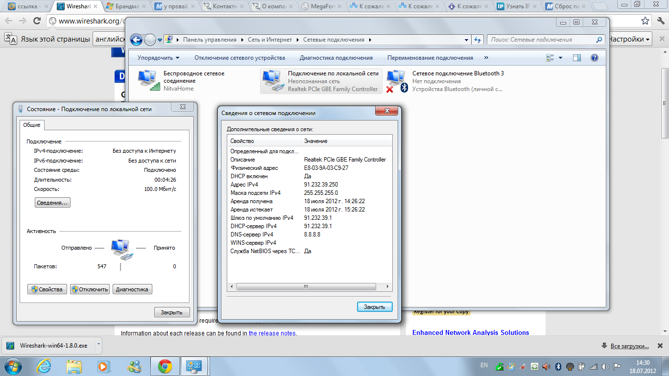 blackcatw Posted July 21, 2012 Posted July 21, 2012 Доброго времени суток. Есть такая проблема абоненты с Windows 7 и Windows Vista не могут подключиться к Интернету. Проблема началась 12 июля 2012 г. И вроде все параметры из сети получают Пример: выдаётся сетевой адрес 91.232.39.233 маска 255.255.255.0 шлюз 91.232.39.1 DNS 8.8.8.8 Сеть W7 не видит, ping не проходит даже до шлюза. И мало того сети присваевается статус "Неопознанная сеть". Этот же шнурок включаю в машину с линуксом.... и всё впорядке.... Т.е. проблема в W7. Если этот шнурок включаю в DIR-300 , а на нём присваиваются "скрые" адреса, то выдаётся адрес 192.168.0.107 маска 255.255.255.0 шлюз 192.168.0.1 DNS 192.168.0.1 И всё начинает работать. В ядре сети в качестве маршрутизатора стоит RouterOS v5.17 стоит как виртуальная машина. Собственно на ней и сделаны все основные настройки. До 12 июля всё было нормально и в сети ничего не менялось, а после начались проблемы. Причём только у тех у кого W7 и W Vista. У кого XP или Linux или стоит за домашним маршрутизатором - всё нормально. Попытался обратиться в официальное представительство Microsoft - там меня вежливо послали. Есть репорт Wireshark report.txt Может кто поможет в беде разобраться? Вставить ник Quote
