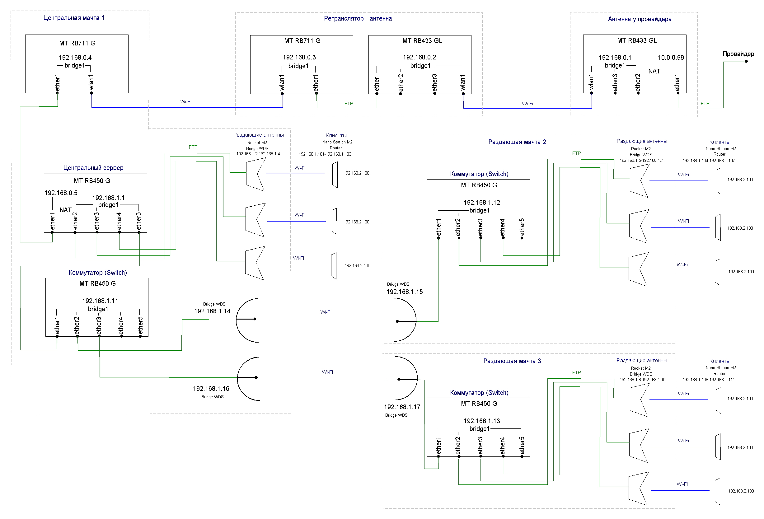 SashaGub Posted September 25, 2012 Posted September 25, 2012 (edited) Здравствуйте, уважаемые форумчани ! Обращаюсь с таким вопросом и прошу технической помощи. Есть сеть в которой сетевое оборудование находятся в одной подсети с пользователями: 1. Антенны, свитчи и серевер спрятаны за портами - зная IP адрес свитча и т.д. по стандартному 80 порту клиенты на него не попадут. 2. Клиентское оборудование находиться за NAT - все что делает клиент он мне не мешает. 3. На всех сетевых свитчах настроен фаервол который фильтрует бед и неверные пакет, частично широковещательный трафик, а также режет некоторые порты. 4. На всех антенна RocketM2 включена изоляция клиентов. 5. На клиентских точках настроен шейпер с чуть большим порогом чем на сервере - чтобы не перегружать Wi-Fi. В принципе эта сеть работает и нормально, пока не стал вопрос о расширении адресного потока, а также внутреннего понятия, что пора перестроить на VLAN чтобы не садить за NAT новые объекты подключения (населенные пункты). Что не нравится в этой схеме (выше представленной): 1. Все таки нету изоляции от широковещательного трафика. 2. Клиенты сидят за 3-йным NATом , а новые населенные пункты будут за 4-ым. В принципе схему сети по IP-адресам можно описать так: 10.0.0.99/192.168.0.1 <-> 192.168.0.5/192.168.1.1 <-> 192.168.1.101/192.168.2.2 Где: адрес 10.0.0.99 - выданный провайдером, / - слеш это NAT, 192.168.0.1 <-> 192.168.0.5 - магистраль 192.168.1.1 <-> 192.168.1.101 - антена - клиент 192.168.2.2 - IP компьютера клиента Вот в принципе можно увидеть схему на рисунке: Я не сталкивался еще с VLAN, почитал много литературы в интернете, но все равно остались вопросы. Из той схемы что есть у меня, хочу посадить каждую мачту (антенну) и клиентов, что сидят на ней в свой VLAN. Например: Центральная раздающая мачта VLAN ID 10 (10.10.10.0/24) Раздающая мачта 2 VLAN ID 11 (10.10.11.0/24) Раздающая мачта 3 VLAN ID 12 (10.10.12.0/24) Как создать VLANы на МikroTik и дать доступ через натирование - знаю, но не знаю как настроить маршрутизацию между выше указанными VLAN и как настроить MikroTik с другой стороны (на мачтах) чтобы клиенты наносы были с IP 10.10.10.2-10.10.10.100. P.S. Ребят, может кто-то может помочь в Киеве, за вознаграждение. P.S.S Понимаю что многие сейчас начнут что тема разжевана, пережеванная но ткните тогда носом куда смотреть, по форуму видел косвенные темы, но все не то. Edited September 25, 2012 by SashaGub Вставить ник Quote