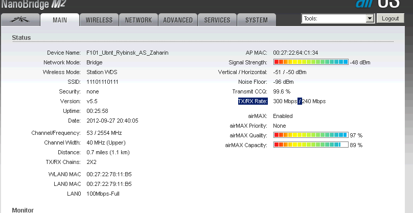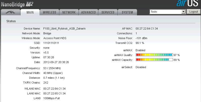 NewUse Posted September 27, 2012 Posted September 27, 2012 (edited) уровни опять поднялись держите ccq на 100%, канальные скорости в 300Мбит в обе стороны, и при соблюдении этих условий найдите минимальную мощность -- это даст максимум скорости :), но это никак не поможет в решении Вашей конкретной проблемы :((( но доступа на удаленную железку нет, в графе ccq прочерк, в графе TX\RX,Mbps первое число 300 второе 0, в обычном состоянии 300\300 или 270\300, в графе last ip написано unknown, хотя device name и MAC удаленной железки определяется Следить нужно со стороны клиента :(, но очень похоже на перезагрузку, я почти на 100% уверен, причин не знаю, возможно питание, не замечали скачки LAN-speed на 10Мбит на клиенте? Сразу после того как в следующий раз прервётся и восстановится связь с клиентом, посмотрите Uptime на нём (предварительно необходимо убедится, что watchdog на нём ОТключен). Edited September 27, 2012 by NewUse Вставить ник Quote