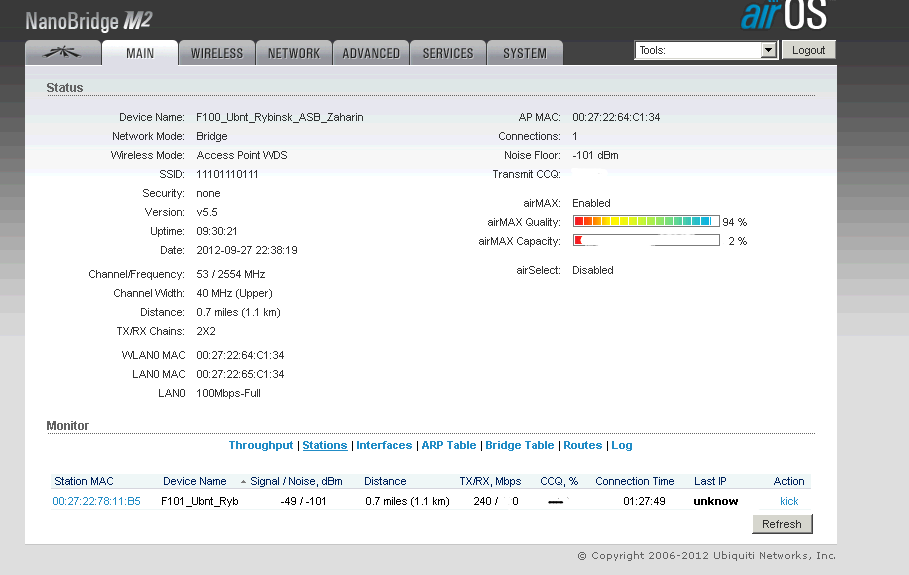 tofu Posted September 27, 2012 Author Posted September 27, 2012 в рамках 5.5 нет, проблем не будет, а вот с даунгрейдом до 5.3 скорее всего будут траблы, так что лучше иметь физ. доступ к девайсам с обоих сторон, если решитесь на даунгрейд. обновился до 5.5.2... уровни опять поднялись, ccq достиг 100%. Вроде пока все нормуль, устройства ведут себя адекватно... тестим, ждем помех правда пока нет скрина в момент траблов. я прикладывал скрин, повторяю... в момент траблов радиолинк якобы есть, но доступа на удаленную железку нет, в графе ccq прочерк, в графе TX\RX,Mbps первое число 300 второе 0, в обычном состоянии 300\300 или 270\300, в графе last ip написано unknown, хотя device name и MAC удаленной железки определяется Вставить ник Quote