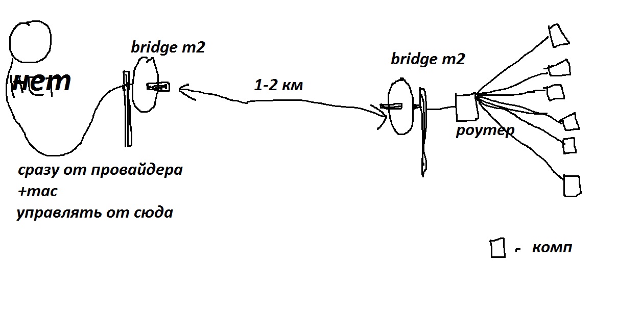 Adim Posted October 26, 2012 Posted October 26, 2012 помогите пожалуйста настроить ,ну никак не получается версия прошивки 5.5.2 что только не перепробовал(новичок), желательно бы скрины вот начеркал который вообще должен быть ap а который station !? в нетворке вообще беда, в интернете полно скринов на мост простейшая настройка ,но не работает изза того что мас не подходит а если через роутер то непонятно как отследить комп которому неположено интернета,вообщем если не сложно на пальцах обьясните пож-та,мнеб желательно два скрина ,настройки первого,второго bridgea Вставить ник Quote