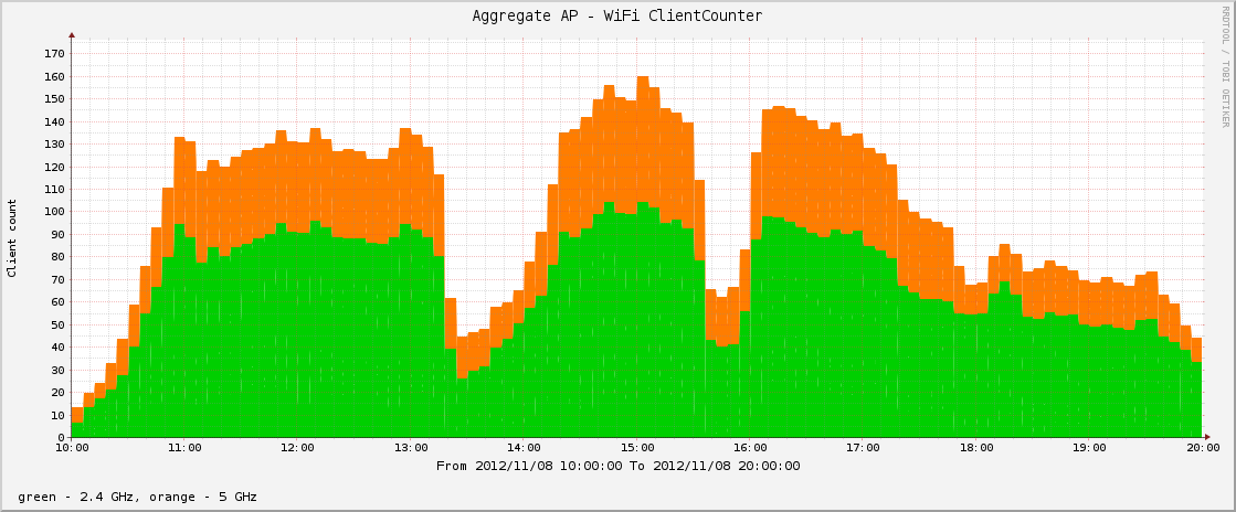 юзерок Posted November 9, 2012 Author Posted November 9, 2012 Saab95, спасибо. Мини-отчет: 802.11B - побоялись убирать т.к. люди пишут, что бывают проблемы при этом с iphone/ipad, а у нас их много. mimo включили. уровень для 2.4 выставили 10дбм, для 5 оставили дефолтный. Суммарный трафик получился не большой - 6 мбит среднее за все время, 40 мбит в пиках - видимо выступления были очень интересные :) Клиенты фактически не жаловались на работу wi-fi. Судя по dhcp было 280 уникальных устройств. По кол-ву клиентов картина такая: Вставить ник Quote