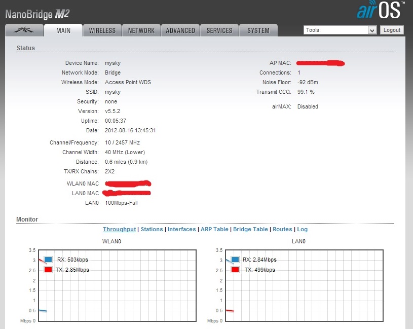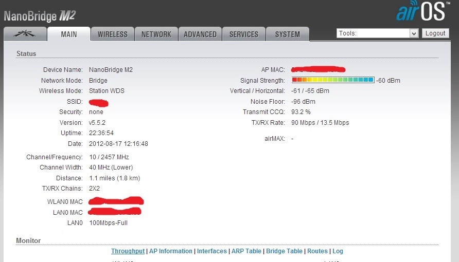 NewUse Posted December 6, 2012 Posted December 6, 2012 (edited) Возможен заводской брак? Да, вероятен. была подобная ситуация летом, но вылечилась сменой прошивки(правда в последствии тарелка сгорела, и была куплена новая). Может у Вас проблемы с питанием? если ставлю 20мгц не хочется соединятся Откатитесь на 5.3.х (у той точки, которая с Вашей стороны), выставьте ширину 5МГц и запустите AirView мощность на бс 20 на второй тарелке 18, ниже если ставить падает сигнал до 65 -70 Сигнал должен быть на уровне -65. У меня на 4км сигналы такие же как и у Вас, а мощность ~14дБм аск на автомате стабильнее, если ставлю до 1 км, то падает ccq Поставьте 2км, но это может свидетельствовать о работе на отражённом сигнале, посмотрите визуально, не свёрнута ли тарелка? Всёж попробуйте в бинокль разглядеть положении облучателя на второй стороне и выставьте аналогично. Вечером можно по положению диодов определить: если диоды с боку -- то и Вас должны быть с боку.... Скрины Мейн--стейшенс с ТД и Мэин-АП с клиента сюды. Edited December 6, 2012 by NewUse Вставить ник Quote