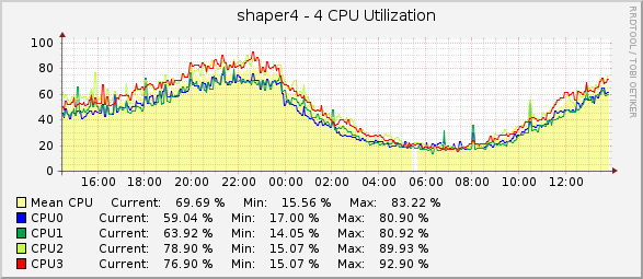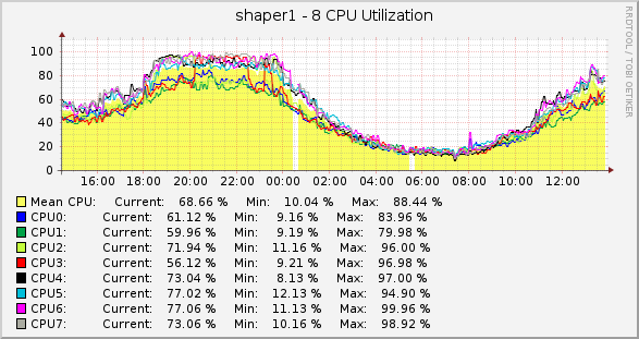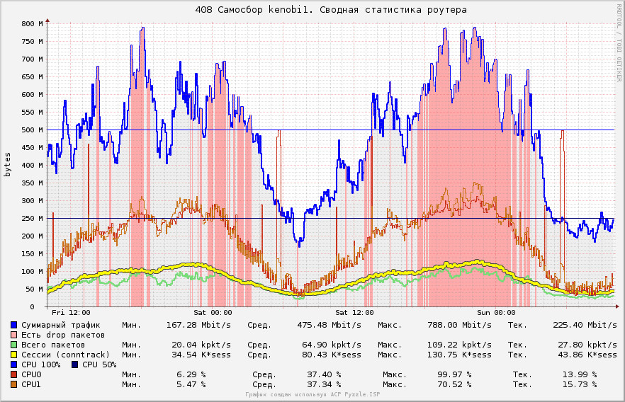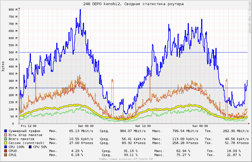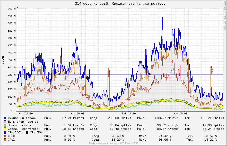 KotikBSd Posted January 12, 2013 Posted January 12, 2013 (edited) Вставлю свои пять копеек, имеем 3 сервера, конфиги такие: Софт везде один: Gentoo 2.6 x86_64 iptables NAT, вкл\выкл достп в инет, редирект на странички блокировки итп... плавила CLASSIFY для шефпинга в tc ipset со списками tc htb по однму на абонента. urlsnarf ipt_netflow (данные отсылаются на другой сервер) bind9 - используется как второй DNS сервер для юзеров которых он обслуживает, это было сделано для балансировки в случае если один из серверов падает его нагрузка переходит на другой. в общем bind не нагружен практически. по этому картины не портит... Схема IPoE Сервера: 1) самосбор model name : Intel® Core2 CPU 6400 @ 2.13GHz --- ДВА ЯДРА таких cpu MHz : 2128.000 cache size : 2048 KB bogomips : 4256.00 Сеть: (одна встроенная вторая внешняя PCI) 00:19.0 Ethernet controller: Intel Corporation 82566DM Gigabit Network Connection (rev 02) 04:03.0 Ethernet controller: Intel Corporation 82540EM Gigabit Ethernet Controller (rev 02) 2) Сервер Depo: model name : Intel® Core2 Duo CPU E7200 @ 2.53GHz --- ДВА ЯДРА таких cpu MHz : 2533.000 cache size : 3072 KB bogomips : 5053.12 Сеть: (обе встроенные) 0d:00.0 Ethernet controller: Intel Corporation 82573E Gigabit Ethernet Controller (Copper) (rev 03) 0f:00.0 Ethernet controller: Intel Corporation 82573L Gigabit Ethernet Controller 3) Покупали б\у DELL фирменный, о чем сейчас жалеем, дешево, но медленно... model name : Intel® Xeon CPU 2.80GHz два ядра cpu MHz : 2792.992 cache size : 1024 KB bogomips : 5586.26 Сеть: (2ве встроенные...) 06:07.0 Ethernet controller: Intel Corporation 82541GI Gigabit Ethernet Controller (rev 05) 07:08.0 Ethernet controller: Intel Corporation 82541GI Gigabit Ethernet Controller (rev 05) п.с. памяти везде два гига. подробнее по платформе типа что за память и мать смотреть лень, если кому-то надо то посмотрю по факту. А теперь графики: на первом графике на дропы внимания не обращайте, там дропы не на абонентском интерфейсе, а скрипты дропы отовсюду снимают, по этому не красиво выходит :) п.с. всплески CPU это скрипты по cronY, архивация... DELL всю картину портит... вот думаю заменить его тоже на DEPOшный сервер, а его отправить на покой какойнить хренью заниматься... что мы не делали, но заставить его работать на ровне с остальными не вышло... Edited January 12, 2013 by KotikBSd Вставить ник Quote