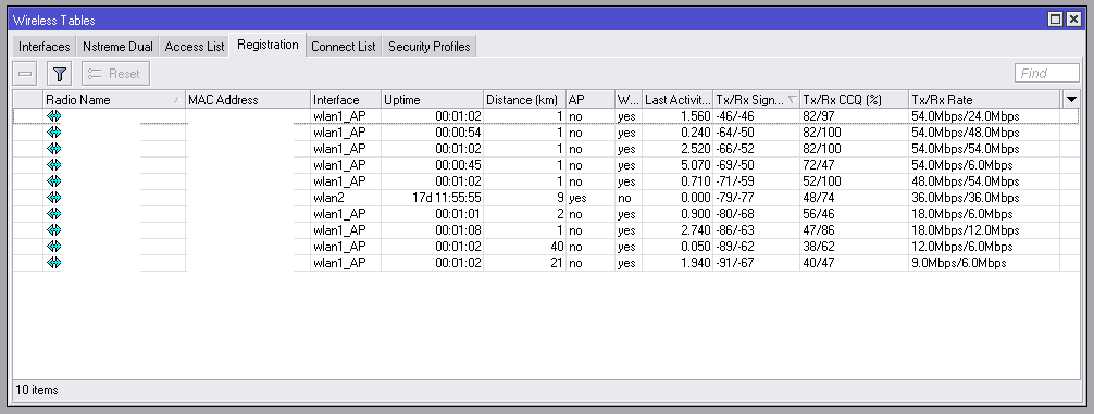 Saab95 Posted December 27, 2012 Posted December 27, 2012 Вот для теста стояла база с мощностью 18дбм, антенна секторная экстралинк 16 дб: Уменьшил мощность до 2дбм, уровни сигналов сильно упали у дальних клиентов: Клиенты 14дб антеннабокс, расстояния до километра. Где-то немного деревья мешают, где-то часть крыши. Однако у ближних клиентов уровень сигнала на прием уменьшился, но не вышел за допустимые пределы. Дальние же сильно потеряли в скорости. Вставить ник Quote
