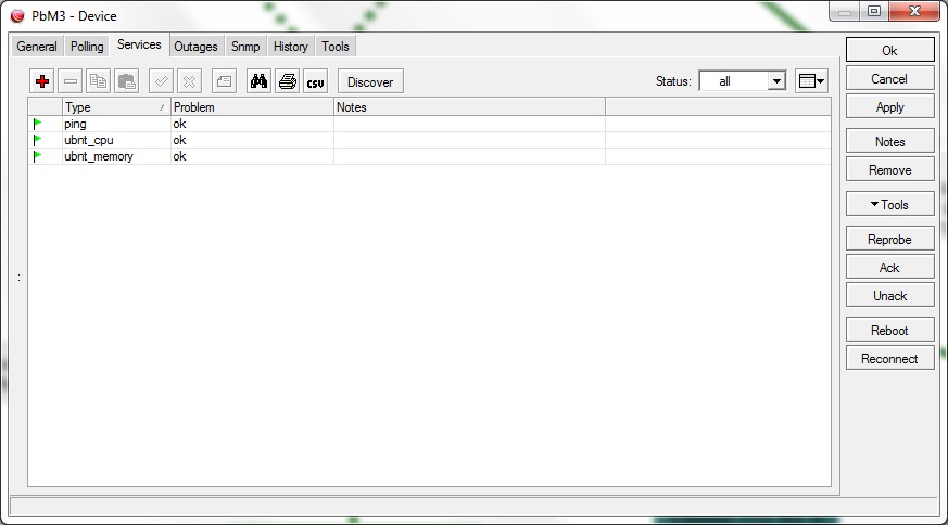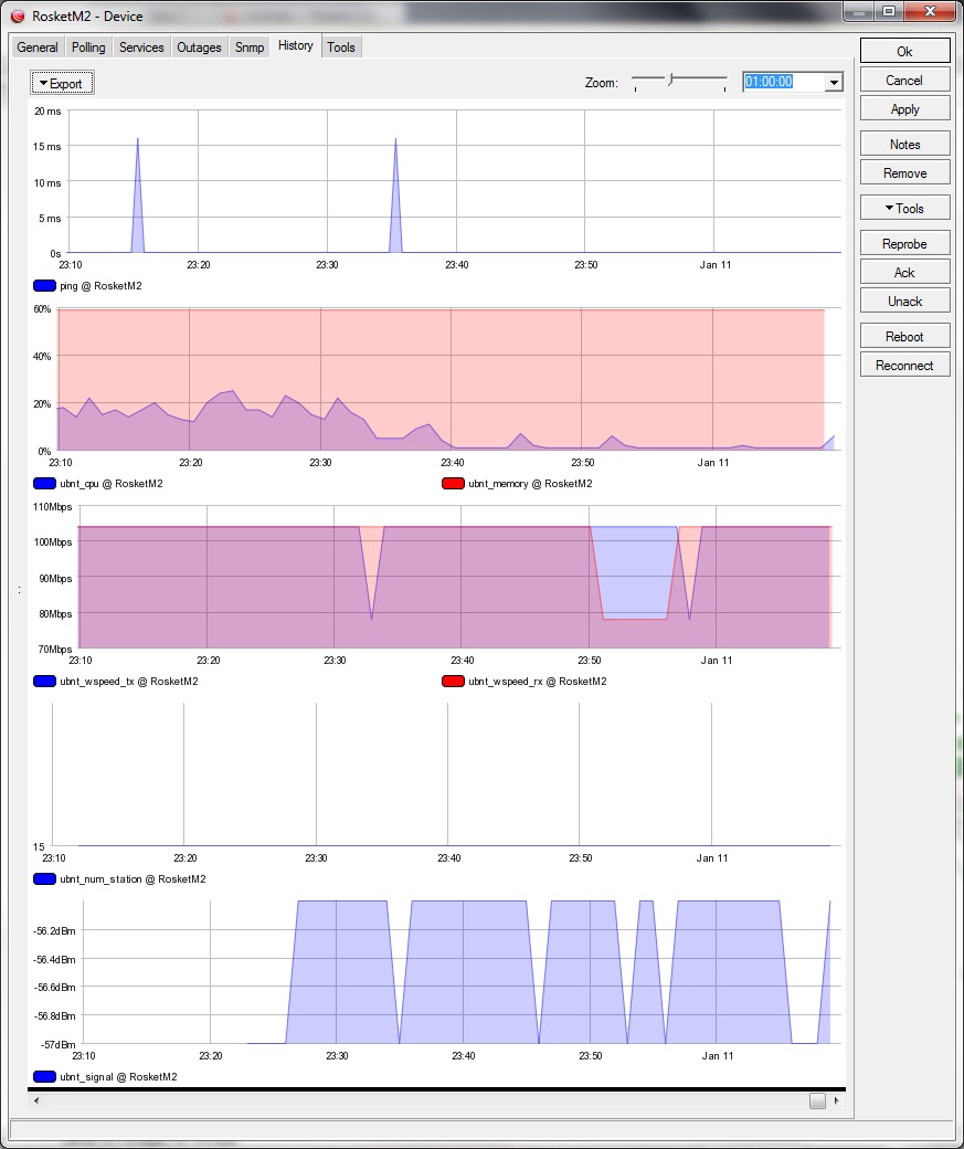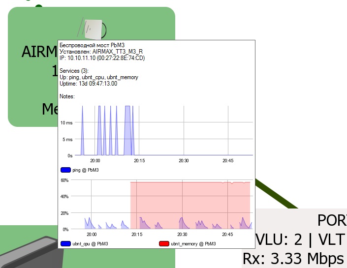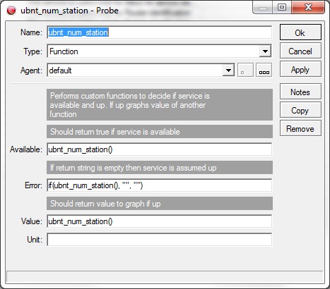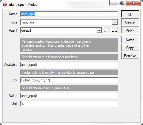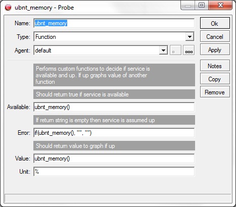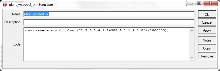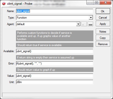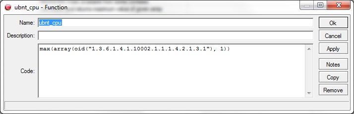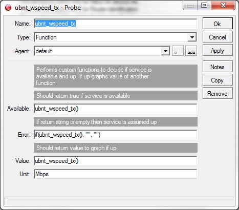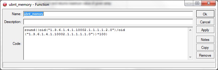 Pritorius Posted January 10, 2013 Posted January 10, 2013 (edited) Ну наверно не для кого не секрет что холивар Микротик против УБНТ давно имеет место быть на форуме NAG, да и NAG уже не тот ((( те кто тут начинали давно стали повыше в должностях и собственно подстать этому сменились темы :) Ну да ладно это лирика теперь про "жить дружно", люблю Микротик за The DUDE буквально обожаю его, за универсальность и гибкость, подтянуть к этой системе мониторинга сети можно всё что угодно. Но вот нормально прикрутить железки УБНТ (естественно М серию) всё руки не доходили и не просто прикрутить а заменить часом разжиревший AirControl. Тем более что вся сеть давно крутится на DUDE и ради УБНТ держать отдельную систему не хотелось. Собственно приступим Часть №1, логируем и мониторим CPU + Memory. 1. Для начала включаем на УБНТ железках - SNMP. 2. В DUDE заходим в ветку Functions, добавляем функцию (кнопкой +). 3. Обзываем функции, дабы потом не путаться ubnt_название_функции, в нашем случае первое что создадим это ubnt_cpu, здесь всё просто снимаем по SNMP загрузку CPU минутную, и для красоты рисуемых графиков (иначе рваные будут) в случае если возвращается 0 заменяем на 1: max(array(oid("1.3.6.1.4.1.10002.1.1.1.4.2.1.3.1"), 1)) 4. Затем создаём ещё одну функцию, ubnt_memory соответственно она будет мониторить использование памяти в процентах, тут тоже особо ничего сложного: round((oid("1.3.6.1.4.1.10002.1.1.1.1.2.0")/oid("1.3.6.1.4.1.10002.1.1.1.1.1.0"))*100) 5. Переходим на ветку Probes, добавляем сервис (кнопкой +). 6. Называем сервисы так же как и функции, первое ubnt_cpu, как заполнить поля: Name: ubnt_cpu | Type: Function | Agent: default | Available: ubnt_cpu() | Error: if(ubnt_cpu(), "", "") | Value: ubnt_cpu() | Unit: % 7. Ну и сервис ubnt_memory, как заполнить поля: Name: ubnt_memory | Type: Function | Agent: default | Available: ubnt_memory() | Error: if(ubnt_memory(), "", "") | Value: ubnt_memory() | Unit: % 8. Дальше просто, открываем Settings уже добавленного на карту устройства UBNT на котором (см. п. 1) уже включен SNMP, переходим в закладку Services и добавляем созданные нами сервисы. 9. В итоге получаем: 10. В отличии от стандартных настроек опрос сервиса cpu поставил раз в 1 минуту, опрос сервиса memory раз в 2 минуты. Далее все части по аналогии с первой, сильно расписывать не буду. Собственно Часть №2, логируем и мониторим Количество станций подключенных к БС. 1. Добавляем функцию ubnt_num_station, здесь не умничая взял рекомендации самого Микротика, чтобы посчитать количество станций нужно посчитать количество элементов массива уровней сигналов от них: array_size(oid_column("1.3.6.1.4.1.14988.1.1.1.2.1.8")) 2. Добавляем соответствующий сервис: ubnt_num_station | Type: Function | Agent: default | Available: ubnt_num_station() | Error: if(ubnt_num_station(), "", "") | Value: ubnt_num_station() | Unit: оставляем пустым 3. Ну и добавляем полученный сервис к нужной нам БС. 4. Время опроса раз в минуту. Собственно Часть №3, логируем и мониторим скорость беспроводного соединения. Тут сразу оговорюсь, для БС скорости высчитываются по среднему между соростями всех подключенных АС, собственно для ПтП тоже самое но так как подключена одна, соответственно она всегда будет средним. 1. Добавляем функцию ubnt_wspeed_tx, расчёт среднего + перевожу в мегабиты/с: round(average(oid_column("1.3.6.1.4.1.14988.1.1.1.2.1.8")/1000000)) 2. Добавляем функцию ubnt_wspeed_rx, расчёт такой же только для RX скоростей: round(average(oid_column("1.3.6.1.4.1.14988.1.1.1.2.1.9")/1000000)) 3. Создаём два соответствующих сервиса: ubnt_wspeed_tx | Type: Function | Agent: default | Available:ubnt_wspeed_tx() | Error: if(ubnt_wspeed_tx(), "", "") | Value: ubnt_wspeed_tx() | Unit: Mbps 4. Второй всё тоже самое только tx меняем на rx 5. Добавляем полученные сервисы к нужным UBNT девайсам на карте. 6. Интервал опроса раз в минуту. Собственно 