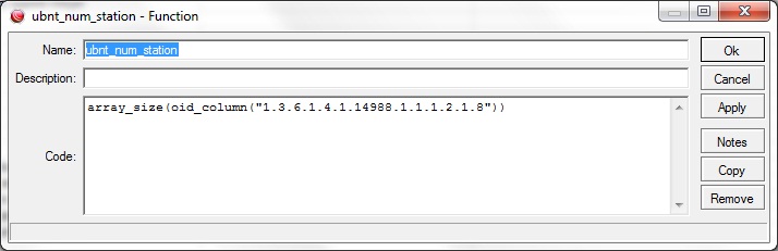 Adim Posted November 21, 2013 Posted November 21, 2013 Собственно Часть №2, логируем и мониторим Количество станций подключенных к БС. 1. Добавляем функцию ubnt_num_station, здесь не умничая взял рекомендации самого Микротика, чтобы посчитать количество станций нужно посчитать количество элементов массива уровней сигналов от них: array_size(oid_column("1.3.6.1.4.1.14988.1.1.1.2.1.8")) 2. Добавляем соответствующий сервис: ubnt_num_station | Type: Function | Agent: default | Available: ubnt_num_station() | Error: if(ubnt_num_station(), "", "") | Value: ubnt_num_station() | Unit: оставляем пустым 3. Ну и добавляем полученный сервис к нужной нам БС. 4. Время опроса раз в минуту. Вставить ник Quote