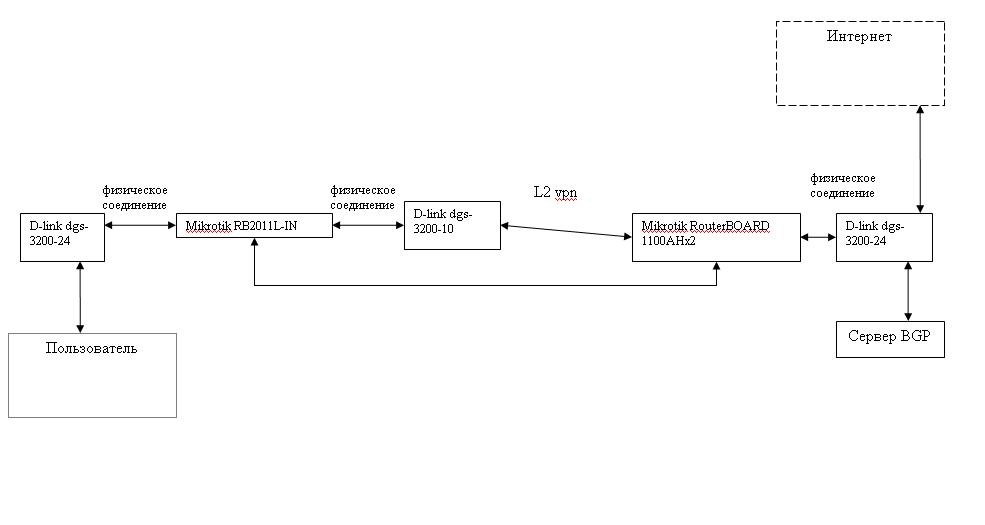 noob2013 Posted January 12, 2013 Author Posted January 12, 2013 Вот такую схему используем. Нужно передать интернет до пользователей. Повторюсь, что канал L2VPN имеет ограничение на 10 mac адресов, поэтому всквозную пользователей на m9 (куда идёт l2vpn) пустить не получилось. Вопрос как быть дальше? Туннель на 2х микроииках работает не корректно. Задачи пропустить 200 Мб/с нет. Нужно до 100 Мб/с без потерь прокинуть по l2vpn. Может предложить другое решение или объясните что у нас сейчас не так? Сейчас при нагрузке бешено растут потери (до 20-30%). Проблему так и не решили ((( сейчас на уровне организации туннеля между эти двумя точками. Наблюдается 20% потеря пакетов при нагрузке. Сейчас нарисуем схему оборудования и каналов, выложим. Уже два дня бьёмся. Может кто исходя из схемы что-нибудь предложит или другое направление/оборудование использовать. у openvpn есть компенсация mtu (что-то вроде tun-mtu 1500, fragment 1300, mssfix), но не уверен, что микротик прокачает 200 мбит по openvpn Ниже выложил схему сети с данной проблемой. 200 Мб/с гнать не нужно. Достаточно 100 Mb/s. Вставить ник Quote