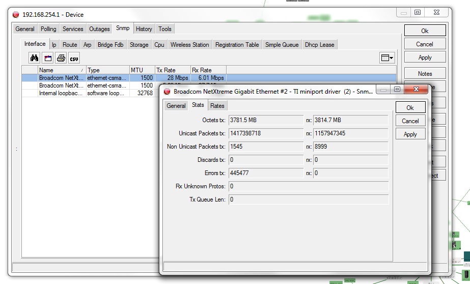 sparker Posted December 27, 2013 Posted December 27, 2013 Как в Dude можно снимать данные pps с микротика ? Интересуют значения Tx Packet(p/s) и Rx Packet(p/s) /interface print oid - выдает текущие количество пакетов на интерфейсе, например packets-in=.1.3.6.1.2.1.31.1.1.1.7.3 packets-out=.1.3.6.1.2.1.31.1.1.1.11.3 т.е. при добавлении в график, он постоянно растет а необходимо каким-то образом вычислить количество пакетов в секунду Вставить ник Quote
