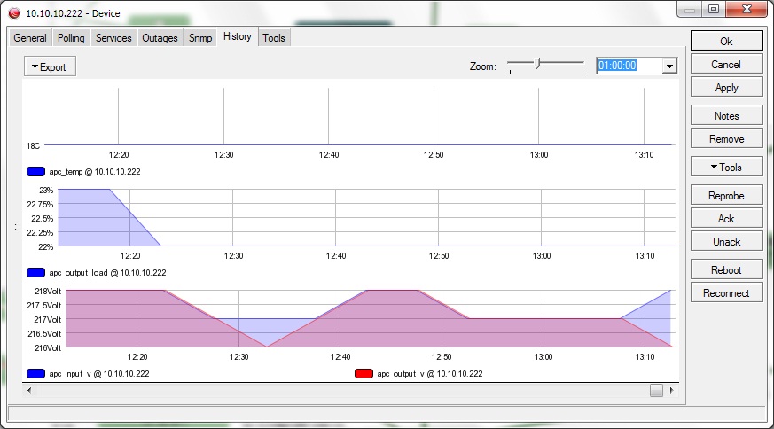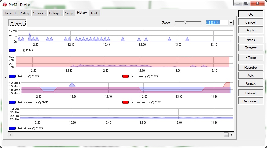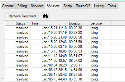 a-zazell Posted January 17, 2013 Posted January 17, 2013 А кто-нибудь знает плагин для кактуса, который по функционалу дает данные, как во вкладке "Outages" (во вложении скрин). В общем журнал выходов из строя оборудования, с началом, концом, рассчитанным периодом и промежуточной статистикой, например как Thold выдает: System <hostname> (<ip addr>) status: UP Current ping response: 61.66 ms Average system response : 51.16 ms System availability: 99.5 % Total Checks Since Clear: 42320 Total Failed Checks: 211 Last Date Checked UP: 2013-01-17 11:58:00 Host Previously DOWN for: 2h 38m 12s Snmp Info: Name - <sw hostname> Location - Uptime - 34d 11h 50m (298025971 ms) System - Cisco Internetwork Operating System Software IOS (tm) C2950 Software (C2950-I6K2L2Q4-M), Version 12.1(22)EA13, RELEASE SOFTWARE (fc2) Technical Support: http://www.cisco.com/techsupport Copyright (c) 1986-2009 by cisco Systems, Inc. Compiled Fri 27-F Вставить ник Quote