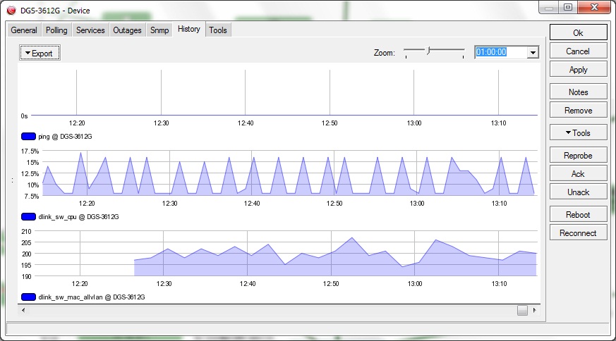 hsvt Posted December 18, 2013 Posted December 18, 2013 Попробовал 2. Дружим с коммутаторами D-Link (Проверенно: 1210, 3010, 3028, 3526, 3612, 3627). Графики рисует норм, но почему то на некоторых длинках пропадает probe и пишет (not available) раз в 10-15 минут и в графиках по CPU пробелы. Пробовал менять интервал зондирования :) и таймаут и snmp настройки кол-во попыток и таймаут - не помогло. В итоге убрал эту функцию и probe. Причем если делать snmpwalk в этот же момент к этим свичат то все значения отдаются. Версия дудки 4.03beta) Если есть у кого то еще подобные OID или фукнции для дудки - был бы признателен. Вставить ник Quote