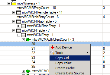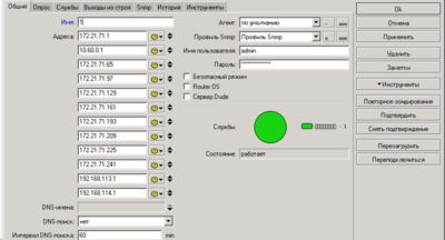 Leshiy Prophet Posted June 20, 2013 Posted June 20, 2013 Добрый день! Есть порядка 400 cisco и dude для мониторинга их. Нужно мониторить по snmp загруженность интерфейсов, а с ними и туннелей, дабы знать где устройства просели, а где провайдер косячит. Помогите! Какие функции и зонды использовать? Если можно то наглядный пример был бы кстати. Итак. Ни одного ответа. Либо нет спецов, либо лень объяснить новичку, что да как. Попробую уточнить свой вопрос. Есть три центральных промышленных маршрутизатора, с которыми по туннелям сообщаются порядка 400 офисных. Нужно знать доступен ли в данный момент тот или иной туннель и какова загрузка на нем. Как вариант можно отобразить на карте все устройства и протянуть между ними линки, на которых и будет показана нагрузка. Но это трудоемкий и не эстетично выглядящий вариант. Подскажите хотя бы функцию для расчета загрузки. Перерыл форум микротика, нашел разные варианты с ifinoctets и out, но они показывают какую то ересь. Если кто сталкивался, прошу помочь. На сколько я знаю импорт не поддерживается. поэтому 400 комутаторов придётся вбивать руками. (ну или создаёте пример. выгружаете бэкап конфигурации. читаете и понимаете формат. генерируете новый и заливаете обратно) По поводу мониторинга: скачайте MIB файл для своих устройств от производителя. загрузите его в любой миб браузер и посмотрите какие параетры может выдавать ваше устройство. Ну а дальше куча примеров как получить в The Dude значения конкретных параметров уже есть, например: oid("1.3.6.1.4.1.10002.1.1.1.4.2.1.3.1") Вставить ник Quote