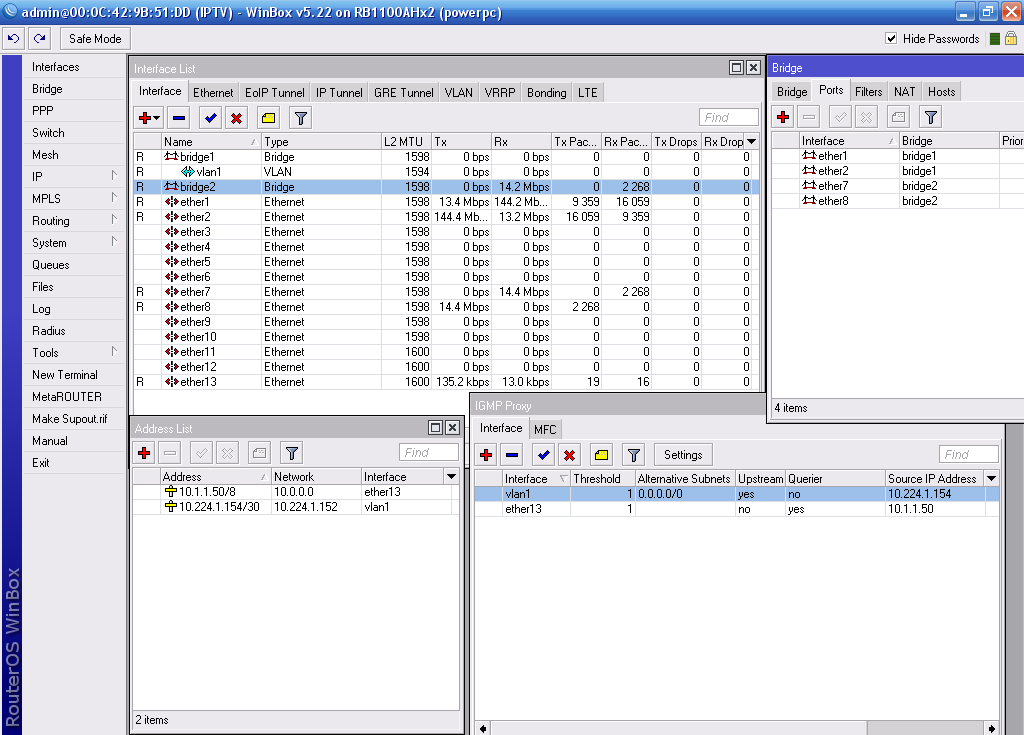 -LOS- Posted January 25, 2013 Posted January 25, 2013 (edited) Мы интернет провайдеры. Предоставляем свое IPTV. Есть возможность дополнительно вещать каналы от вышестоящего провайдера. Для этих целей пытаемся использовать RB1100AHx2. Схема такая: Bridge 1: ether1 (аплинк от провайдера), ether2 (вход в наш сервер), vlan1 (влан для IPTV от провайдера). Bridge 2: ether7 (наш стример), ether8 (выход а нашу сеть на DGS-3420-26SC и DES-3528 настроенные под мультикаст). Ether 13 временно подключен к компьютеру администратора. Настроил IGMP Proxy между vlan1 и Ether 13. Префикс I (Inactive) пропал. Но каналы провайдера в IPTV Player не показывают. Плейлист провайдера 100% правильный. Пинги на стример провайдера с микротика есть. Использовал для настройки помино мануалов на официльном сайте еще и вот это http://www.technotrade.com.ua/Articles/iptv_config_mikrotik.php Что может быть не так? Или может быть посоветуете заменить микротик чем нибудь другим? Edited January 25, 2013 by -LOS- Вставить ник Quote