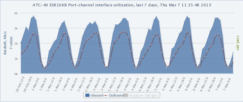 StSphinx Posted March 7, 2013 Author Posted March 7, 2013 Странные у вас даташиты В routerperformance.pdf для 10000-PRE2 в фастсвичинге 6,200,000 pps и 3,174.40 Mbps или есть какой-то другой даташит? Ну значит у меня глюки... Вот график загрузки одного из интерфейсов: Вставить ник Quote