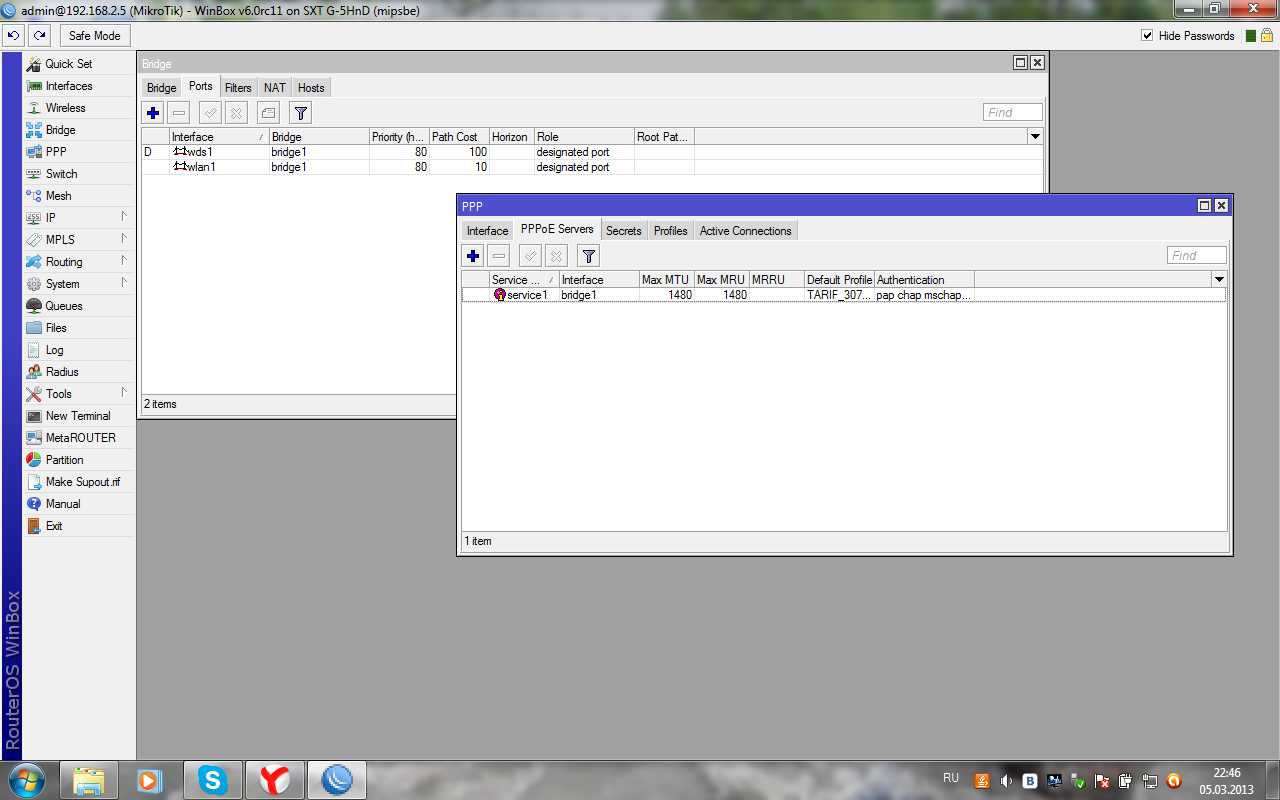 igorek69 Posted March 5, 2013 Posted March 5, 2013 Уважаемый Сааб,помогите мне разобраться с настройкой PPPOE Сервера на SXTG . как это делается, и нужно ли при этом создавать ДХЦП сервер, сейчас база у меня подключена к инету и я удаленно могу заходить на нее и интернет у меня есть,проблема в том, что создаю РРРОЕ сервер прописываю пул адресов,ставлю бридж 1 на этот сервер но с компьютера рррое соединение не подключается. подскажите как правильно это сделать на базе,на клиентском микротике и на компе. Спасибо заранее, надеюсь на Вашу помощь...