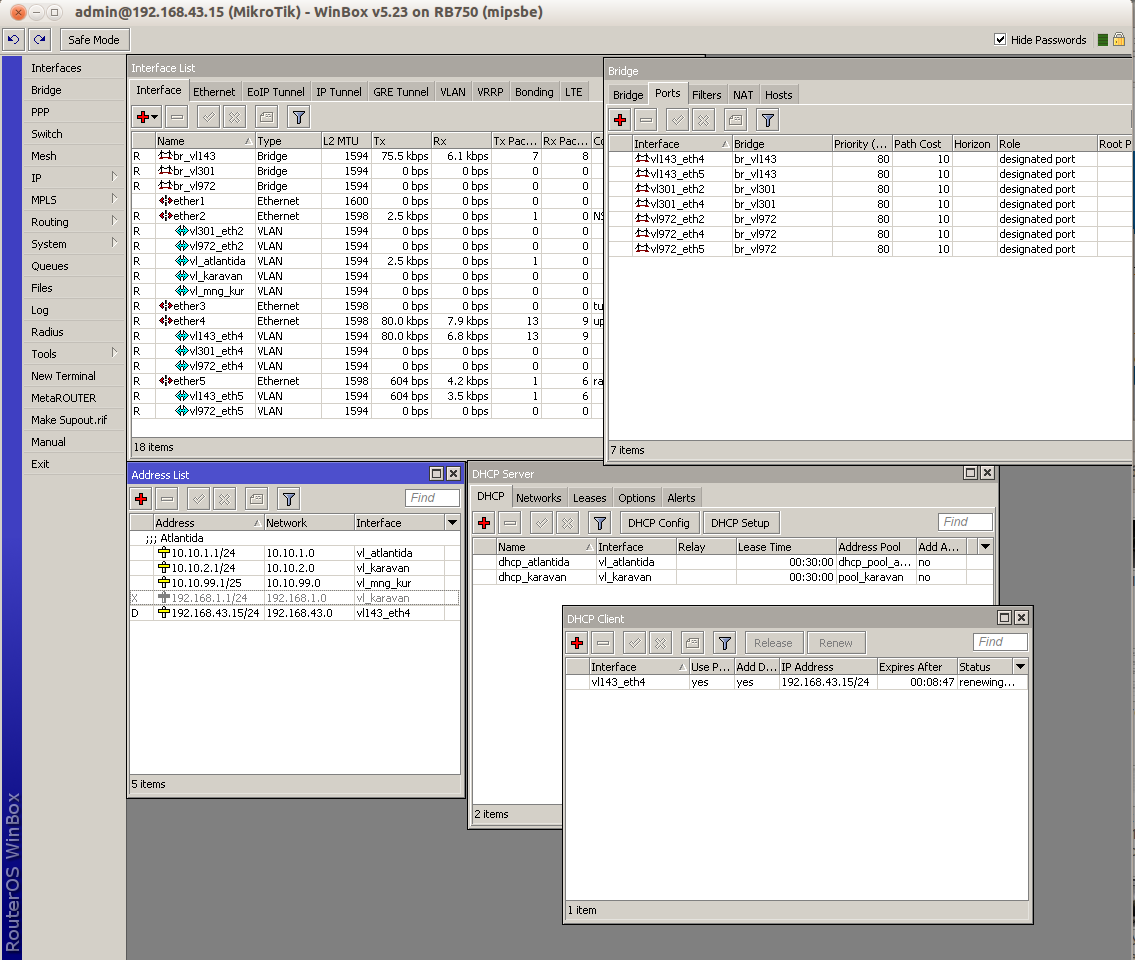 DMiTRONiK Posted March 7, 2013 Author Posted March 7, 2013 для 143 влана dhcp сервер там же где и для самого микротика, у провайдера. мне не нужно что бы за микротиком нормально компы получали адреса, это одно физическое лицо, с внутренней сетью, из нескольких зданий, на небольшом расстоянии. И параллельно микротик должен пропускать чистый L2 между ether2, ether4 и ether5. Но в тоже время через ether2 должен предоставлять сеть+интернет, дальше за портом стоит оборудование которое рулит вланами, с этим проблем нет. Проблема в том, что в таком исполнении дшсп-клиент не может нормально продлить аренду адреса. Вставить ник Quote