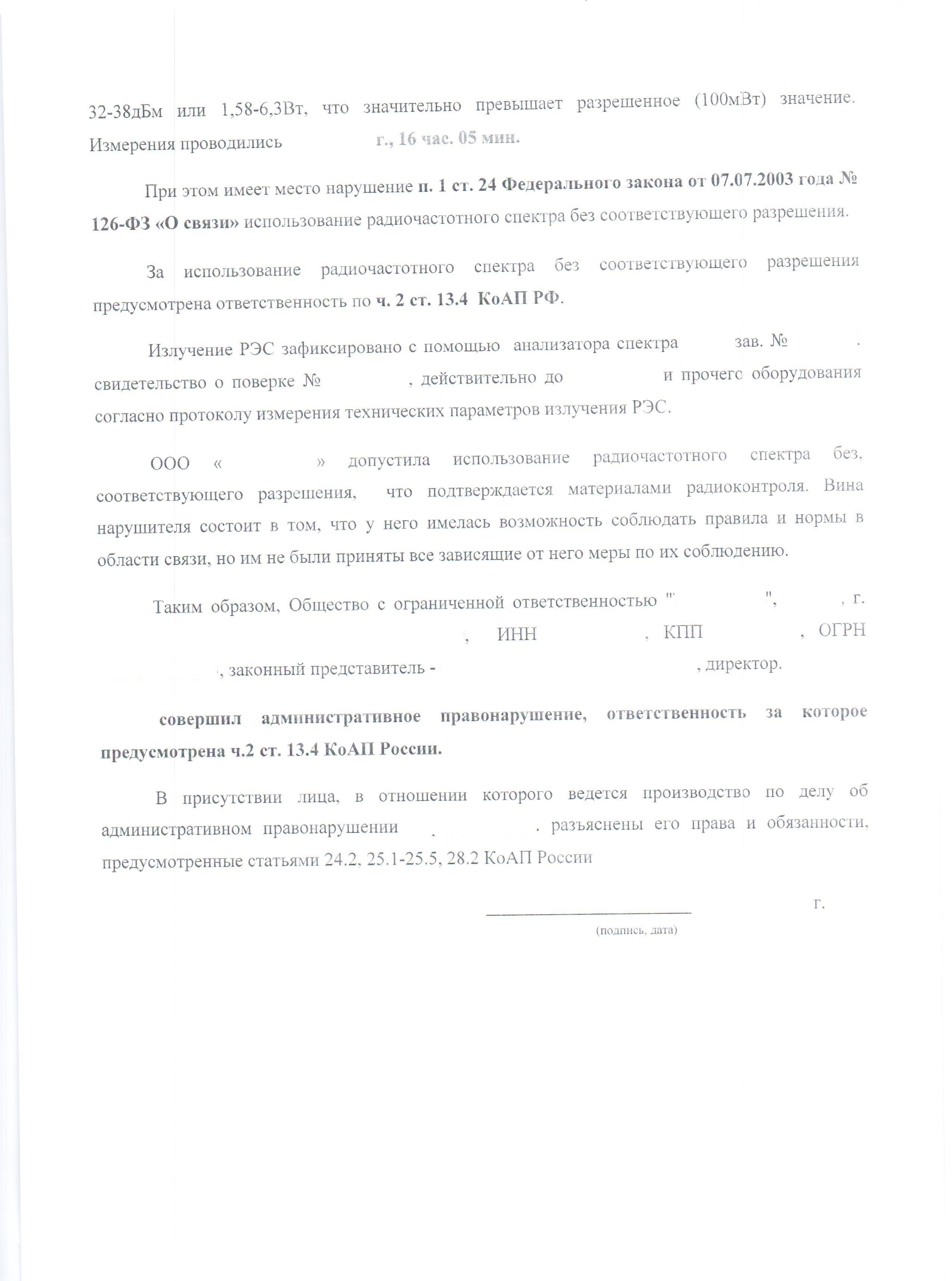 Галушко Дмитрий Posted April 5, 2013 Posted April 5, 2013 В ППРФ есть отдельные подпункты. В данном подпункте не сказано об ограничении по мощности, значит его нет. А в других сказано, но не сказано про высоту подвеса. Или ко всем пунктам не выше 10 м? У нас есть п. 24, в нем всё и сказано. И про мощность, и про высоту. Соответственно 10м. для всех РЭС к которым данный пункт (24-й) относится. Даже если мощность у них свыше 100 МВт и Вы на них получили РиЧ Если мы получили РИЧ и не зарегистрируем РЭС, через год его у нас отберут. Это раз. П. 1.3. в условиях РИЧ: "РЭС, используемые в соответствии с настоящим разрешением, подлежат регистрации. Использование РЭС без регистрации не допускается." Если мы не зарегистрируем РЭС, это будет нарушением условий РИЧ, а это уже нарушение лицензионных условий, и ответственность куда более суровая. Это два. Так что если РИЧ есть - регистрация обязательна. Что-то не верю, что штрафуют, Так правильно, по ч. 1 ст. 13.4 (без регистрации) не штрафуют, штрафуют по ч.2 (без РИЧ) Может и протокольчик выложите о наложении штрафа по ч.2 ? Перс. данные можно замазать. Вставить ник Quote