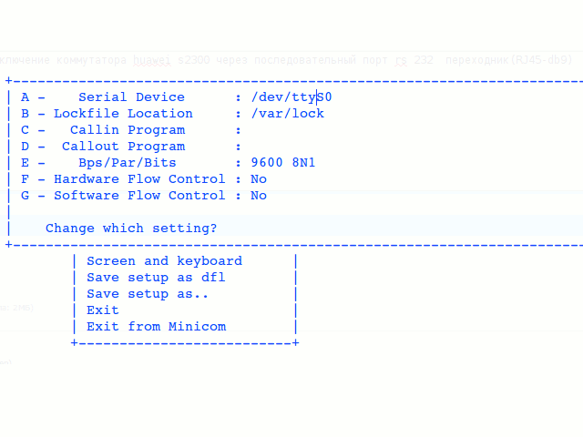 yoyoshi Posted March 29, 2013 Posted March 29, 2013 Доброго времени суток уважаемые, столкнулся с проблемой подключение коммутатора huawei s2326tp-ie через последовательный порт rs 232 переходник(RJ45-db9) по средствам minicom и OC ubuntu настройки подключения к коммутатору приведены на рисунке. с этими же настройками без проблемм заводятся коммутаторы от dlink-a (3200) и всё остальное которое работает на скоростях 9600 и 115200 вывод команды dmesg | grep tty 0.000000] console [tty0] enabled [ 0.223595] serial8250: ttyS0 at I/O 0x3f8 (irq = 4) is a 16550A [ 0.312987] serial8250: ttyS1 at I/O 0x2f8 (irq = 3) is a 16550A [ 0.354467] 00:06: ttyS0 at I/O 0x3f8 (irq = 4) is a 16550A [ 0.440749] 00:07: ttyS1 at I/O 0x2f8 (irq = 3) is a 16550A подключатся пробывал на порт S0 и S1 ,безрезультатно! у кого какие предлжения. Спасибо. Вставить ник Quote