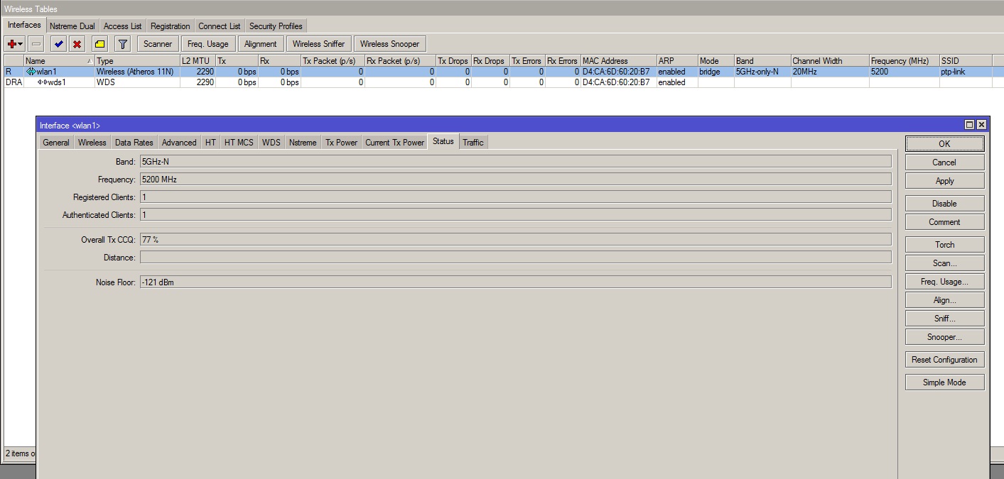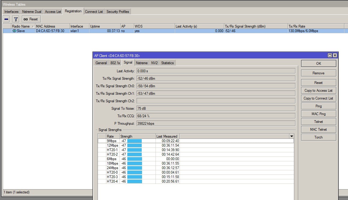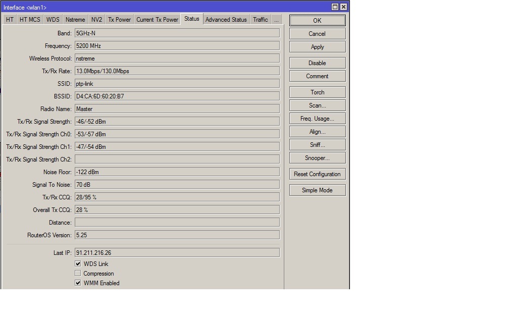 QWE Posted May 18, 2013 Author Posted May 18, 2013 Микротики установлены. Вопросов много даже несмотря на то что перелопатил пару раз ветку про микротик. Напомню, что между точками преграда - две линии ЛЭП и свисающие провода (16 штук), расстояние в пределах 1 км. На точках установлена версия RouterOS 5.25, многие вкладки отображают информацию не так как в прошлых версиях OS судя по ветке на форуме - микротик. Параметры сигналов обнаружились на Микротике который мастер на вкладке Registaration, т.е. со стороны клиентской точки. Может по другому с клиентской точки winbox работает. Это не главное. Для соединения жестко выбрана частота 5200МГц,полоса 20МГц. На мастере TX Power 15dBm. 1. Что можно сказать про позиционирование антенн в условии существующей преграды по скрину? 2. В ветке пишут про перекосы ( Tx/Rx Signal Strength), судя по цифрам у меня он есть. Это может быть из за проводов или нужно правильно позиционировать? 3. Как правильно и в какой последовательности делать юстировку, на какие цифры в winbox-е обращать внимание? какую антенну оставить в покое для начала с какой начать вращение вокруг столба? как увидеть что вращать достаточно и можно юстировать в вертикальной плоскости? Какие тесты закачек при этом проводить чтобы было видно что антенны корректно спозиционированы? Как это сделать профессионально с пониманием? Нужно ли ориентироваться на LED на корпусе при юстировании? Опять же как определить неправильную поляризацию? Что это вообще такое? Синоним слова позиционирование? 4. Насколько сильно влияние если допустим антенны идеально спозиционированны и находятся на одной оси, но относительно этой оси повернуты? 5. Noise floor -121dBm на базе о чем говорит? Сколько dBm много или мало и для чего? 6. О чем еще говорят цифры на картинках - отношения сигнал шум, Tx/Rx Signal Strengh? Норма? Вставить ник Quote