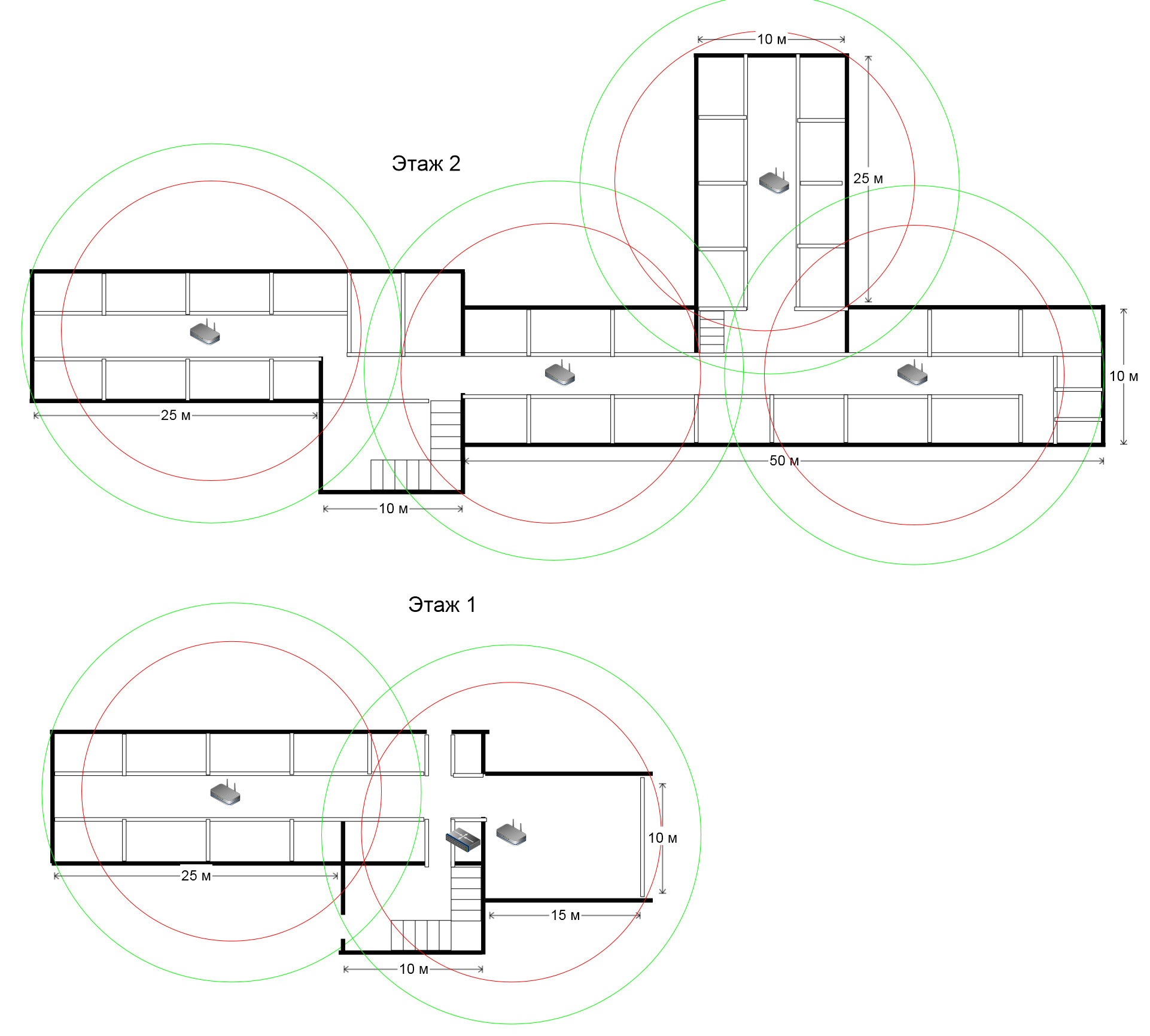 SSD Posted May 29, 2013 Posted May 29, 2013 Здравствуйте, уважаемые форумчане! Понимаю, что баян, но помогите пожалуйста с выбором оборудования в гостинницу образца 18 века. Задача: раздать бесплатную вафлю (VLAN1) и вафлю для персонала (VLAN2) в помещении от беспроводного провайдера. Канал оооочень узкий, вариантов других нет, но не суть. Примерная схема сети: Исходные: максимум 30 абонентов на VLAN1 максимум 4 абонента на VLAN2 потолки 310 см толщина несущих стен (черные на плане) 150 см, камень (монашеская постройка) толщина стен в номерах 50 см, кирпич перекрытия деревянные, потолок в гипсокартоне частые перебои с электричеством План помещения (кривой, примерный): Схватил что валялось дома (Asus WL-500gP) и прошелся по этажам с тестером (как нарисовано на плане красным). Жирные стены практически непробиваются. Планирую: Mikrotik RB2011L-IN EnGenius EAP150 в качестве AP's на потолке гипсокартонном Ubiquiti NanoStation M2 на прием вафли от провайдера пробросить от MK кабель ко всем точкам, там же в подсобке PoE-гирлянду на стабилизаторе Перая мысль была взять UniFi, но не знаю какая запара с контроллером, тем более в гостиннице нет ни одного компа (ноутбук не в счет). Хочу схему: поставил и забыл, ковыряться с паяльником - не вариант. Денег у заказчика не много, сегмент сами понимаете "пионерский". Как вариант, вместо EnGenius аналоги: D-link DWL-2600AP (стремно как-то) или TRENDnet TEW-653AP (по хар-кам хуже) Пожалуйста помогите с окончательным выбором оборудования, т.к. микротиками не пользовался вообще, имею дело постоянно только с NanoStation, Bullet и всякой домашней шелупонью. Контроллер юнифай нужен только для настройки, может работать и без него. При необходимости можно сделать контроллер на такаом борде (http://www.pcengines.ch/alix.htm), будет очень компактно и не дорого Вставить ник Quote