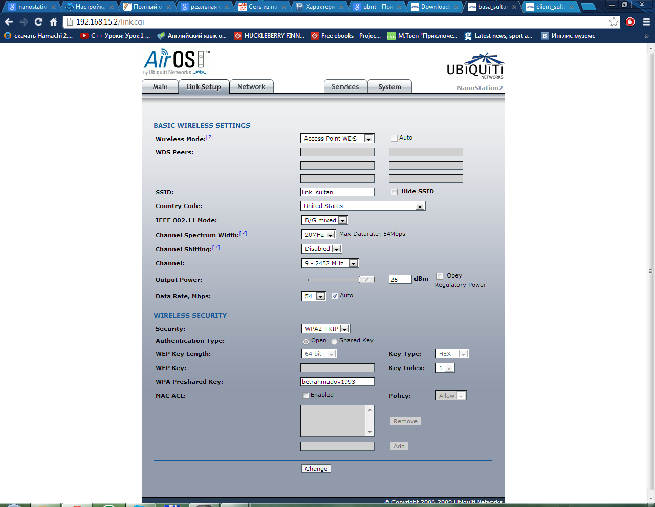 resterwolf Posted June 4, 2013 Здравствуйте. Уже долгое время меня мучает моя беспроводная сеть. Дело в том что я живу в частном секторе и имею последнюю милю в виде беспроводной сети из 2 устройств nanostation 2. Заявленная скорость 20 Мб/c, однако фактически от 10-18. Расстояние не больше 1.5-2.5 км. видимость прямая. Думал о смене рабочей частоты, однако боюсь потерять доступ к отдаленному насосу и по этому решил пока ни чего не трогать и спросить у знающих людей. Прикрепил скриншоты настроек точки доступа и станции. Жду помощи) Share this post Link to post Share on other sites More sharing options...