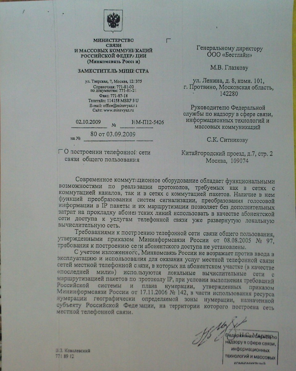 Goog Posted June 24, 2013 В изначальном сообщении явно написано "Часть номерной емкости раздается по ip". А это "передача данных для целей передачи голосовой информации". "Часть номерной емкости раздается по ip" совсем не означает "передача данных для целей передачи голосовой информации" 100500 раз обсуждалось и мусолилось. Во вложении письмо регулятора, которое уже здесь выкладывали. Опишите правильно с точки зрения нормативки сеть и раздавайте абонентам номера по IP. Не пишите только про "передача данных для целей передачи голосовой информации", ибо (ИМХО) эта лицензия с текщими НПА не реализуема. Share this post Link to post Share on other sites More sharing options...